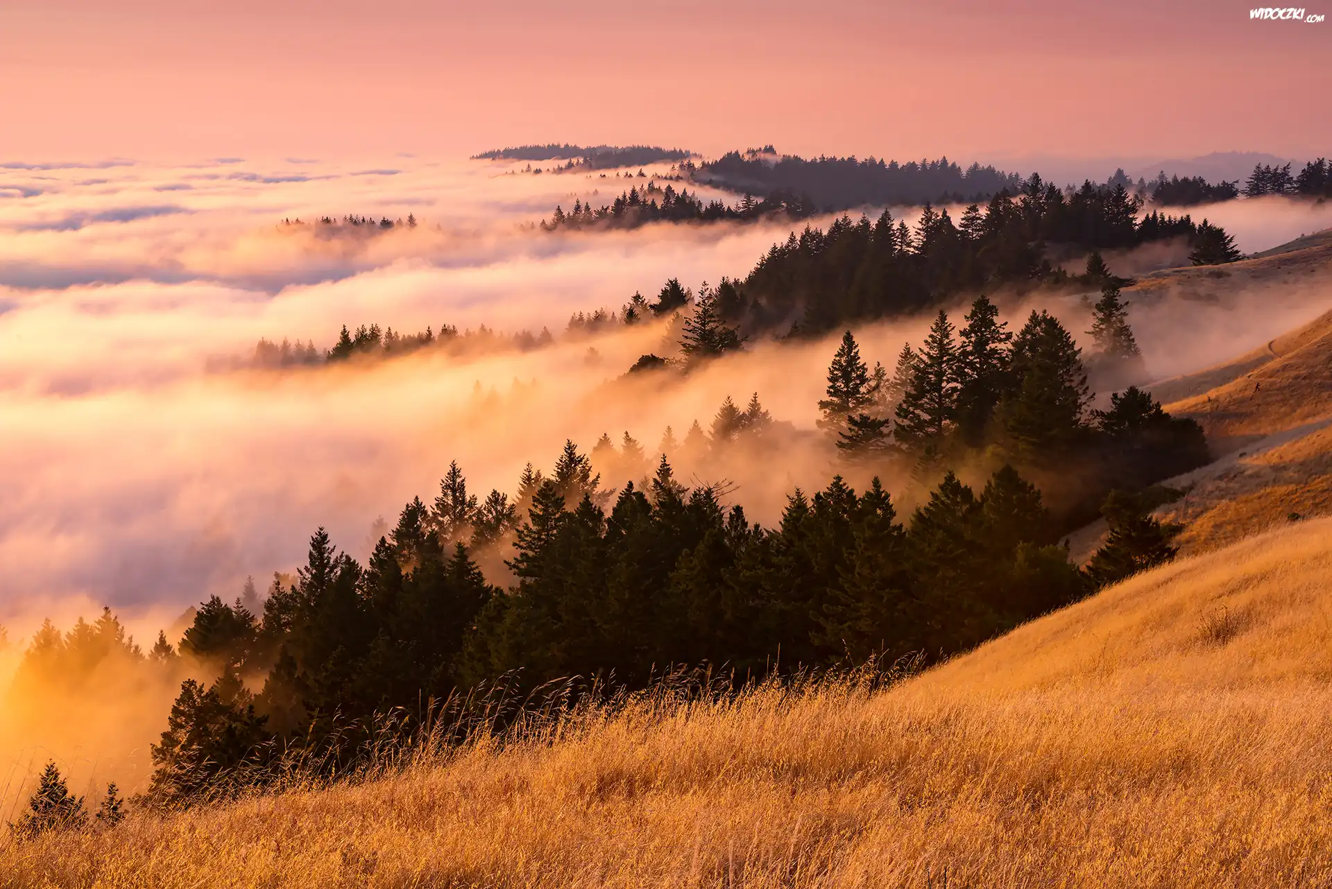Zdjęcia, Las, Mgła, Łąki, Wzgórza