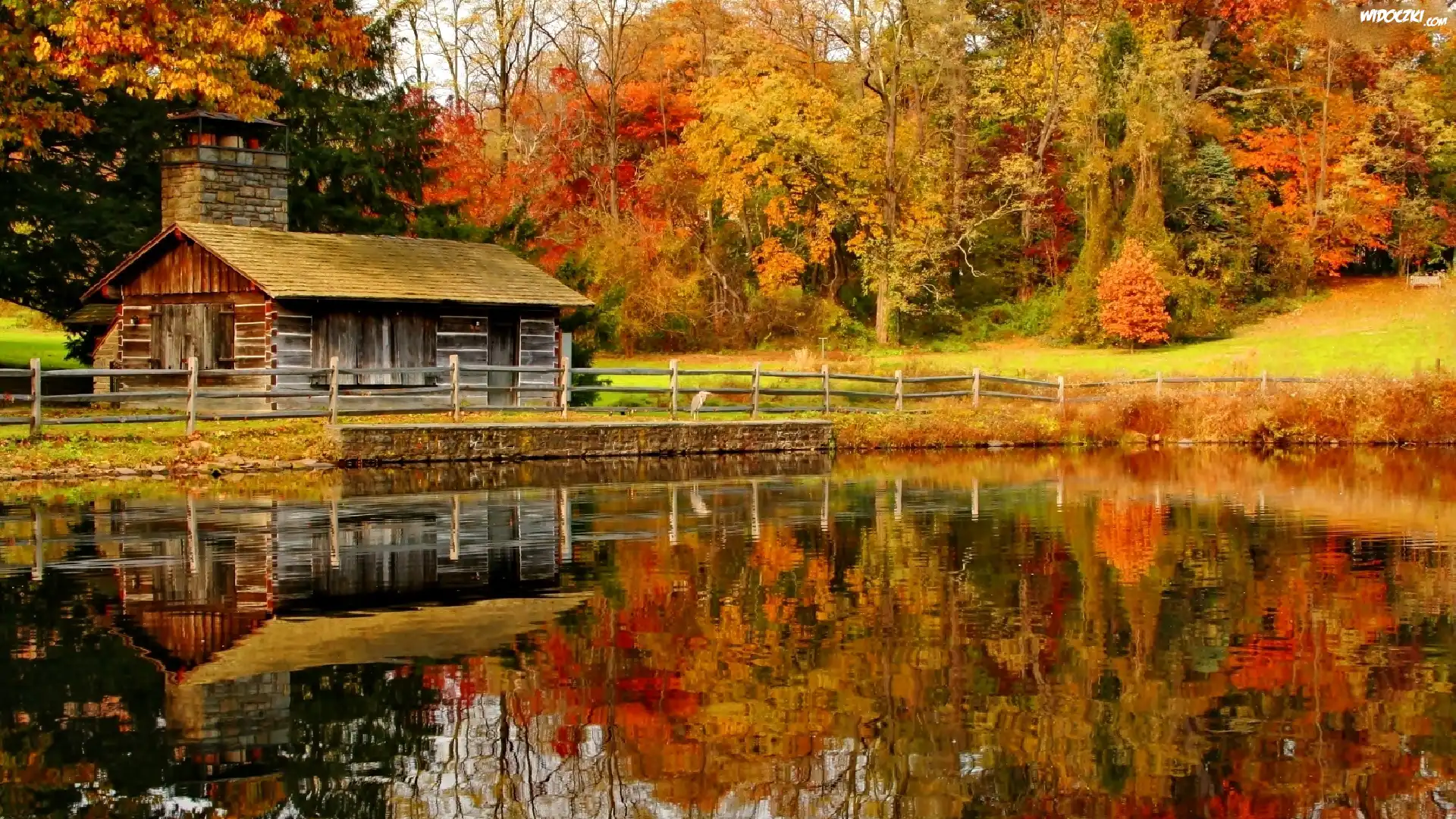 Las, Kolorowe, Liście, Staw, Budynek, Odbicie