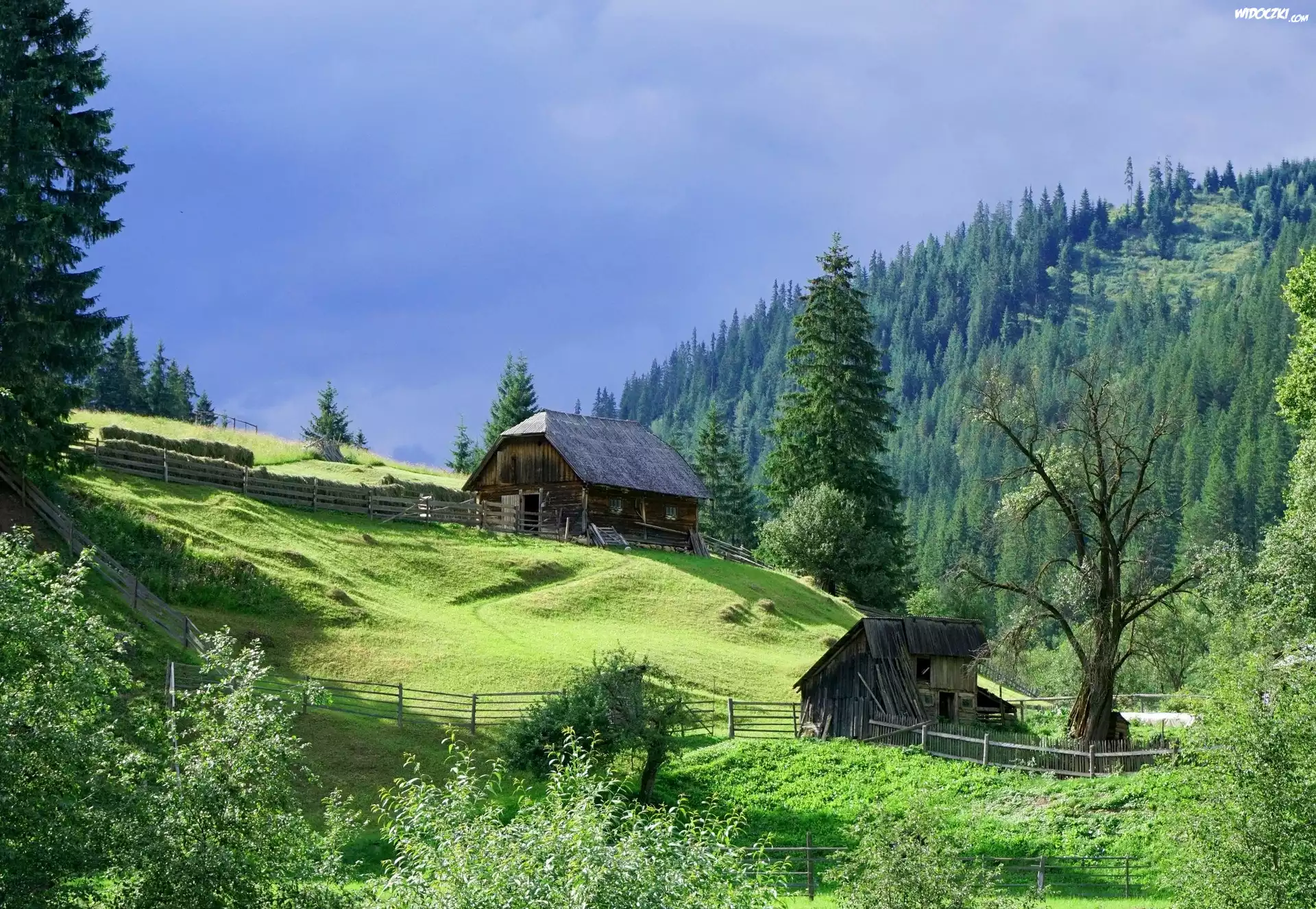 Zdjęcia, Las, Drzewa, Wzgórza, Chata, Ogrodzenie