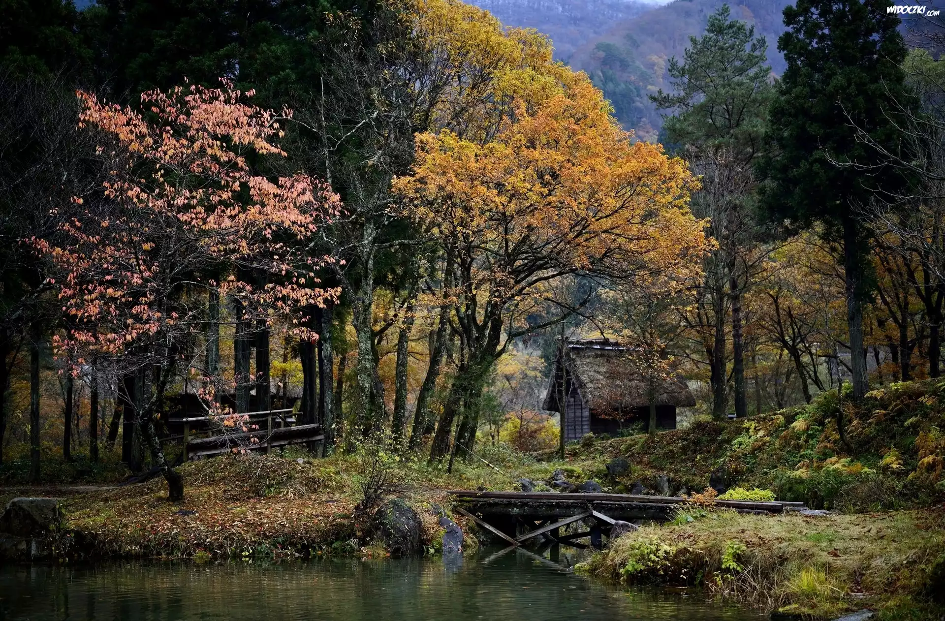 Zdjęcia, Las, Rzeczka, Chatka, Pomost