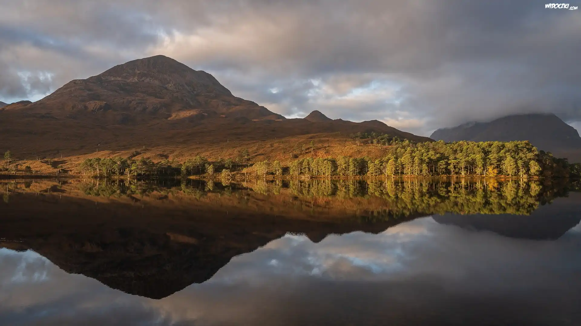 Góry, Jezioro, Drzewa, Las, Odbicie, Chmury