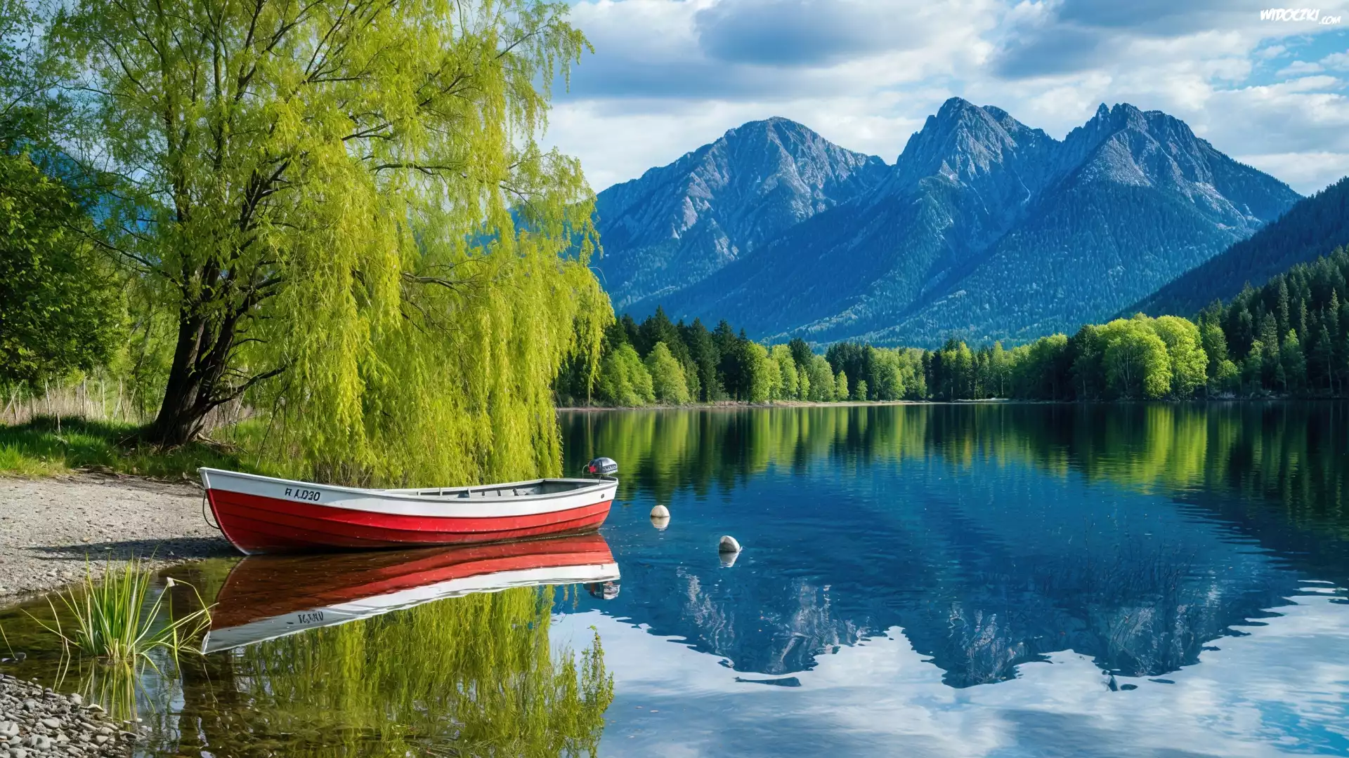 Zdjęcia, Góry, Jezioro, Łódka, Las, Drzewa, Chmury