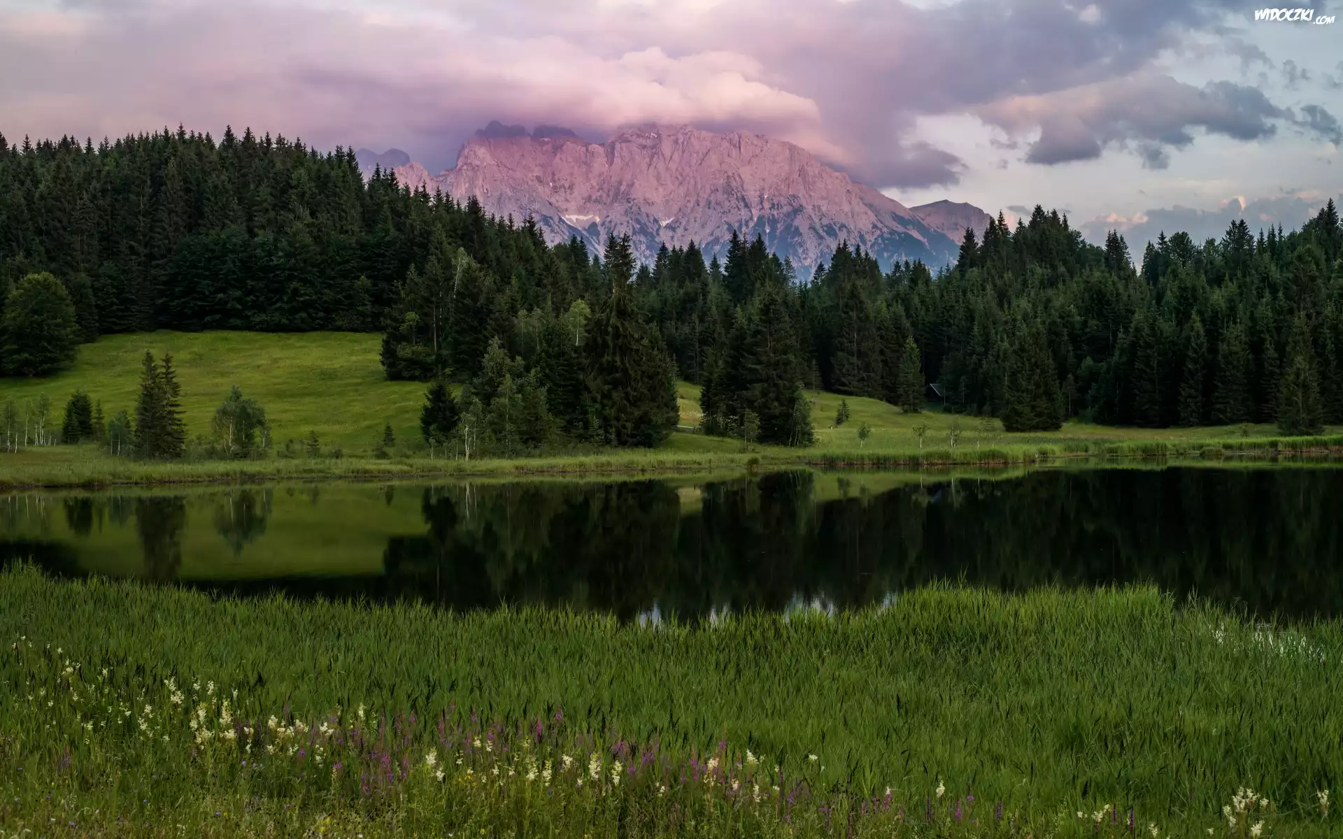 Zdjęcia, Las, Drzewa, Trawa, Chmury, Kwiaty, Góry, Jezioro, Odbicie, Chmury, Lato