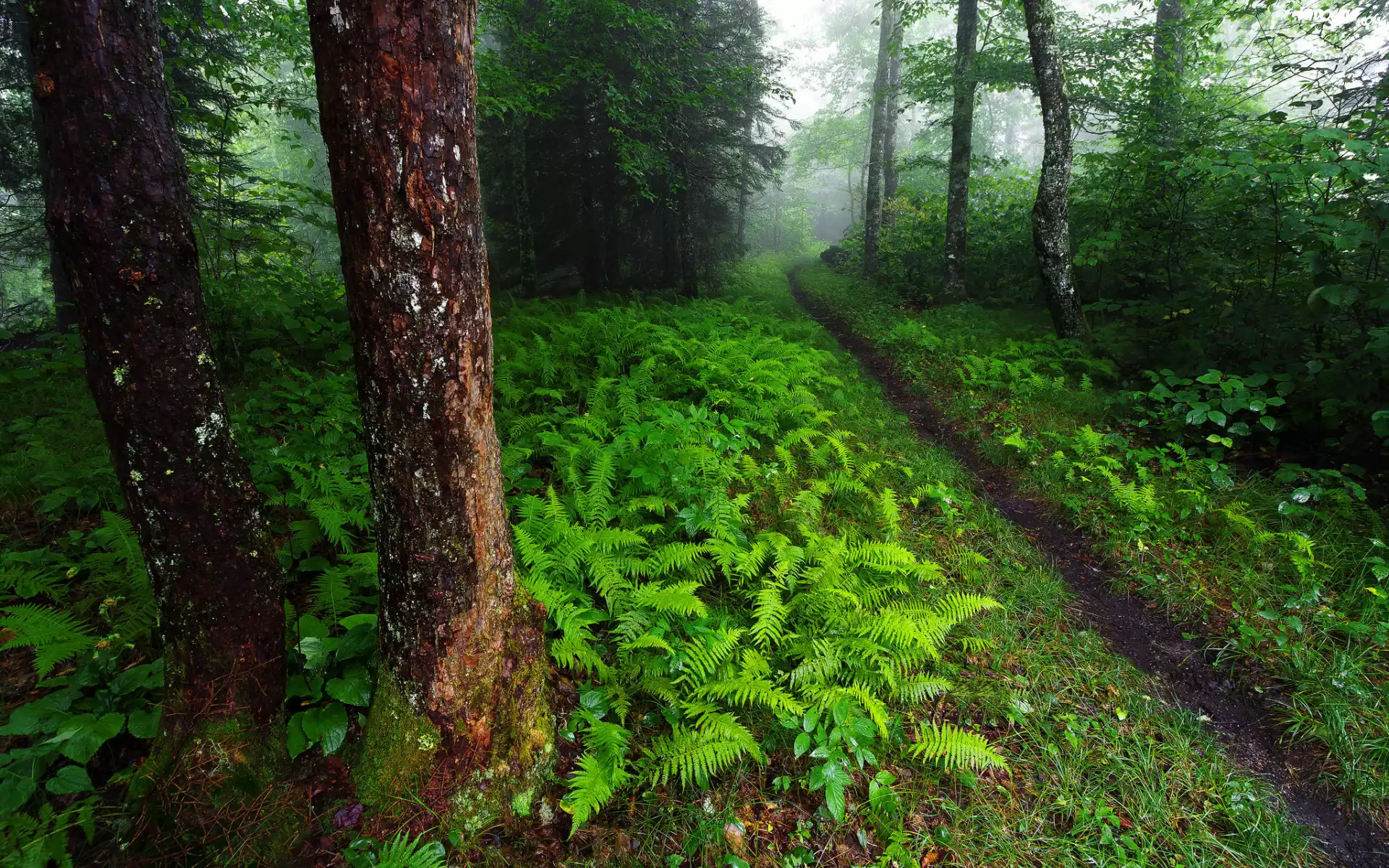 Las, Drzewa, Krzewy, Paprocie, Ścieżka, Mgła