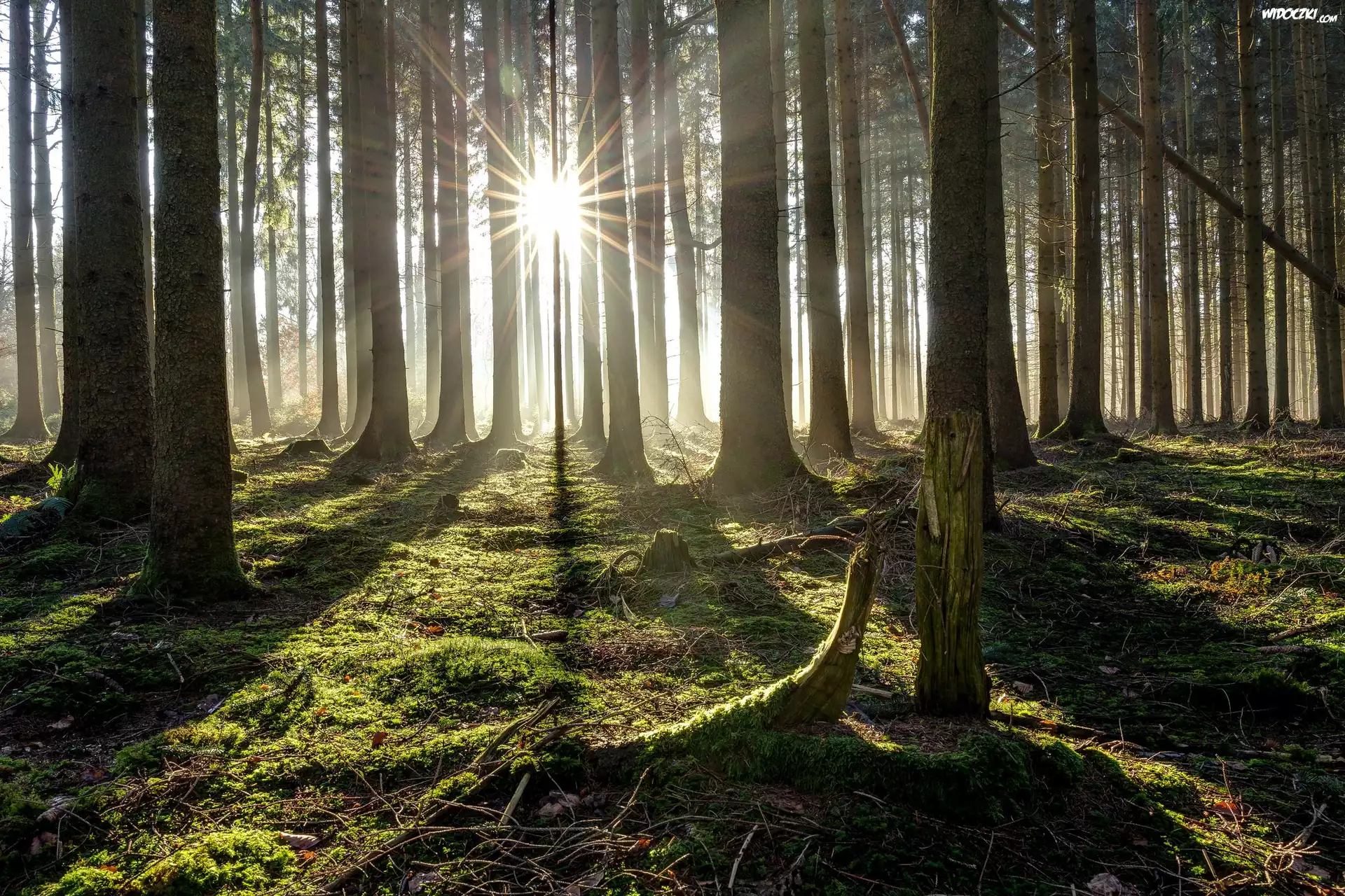 Zdjęcia, Las, Drzewa, Promienie słońca, Ściółka, Mech