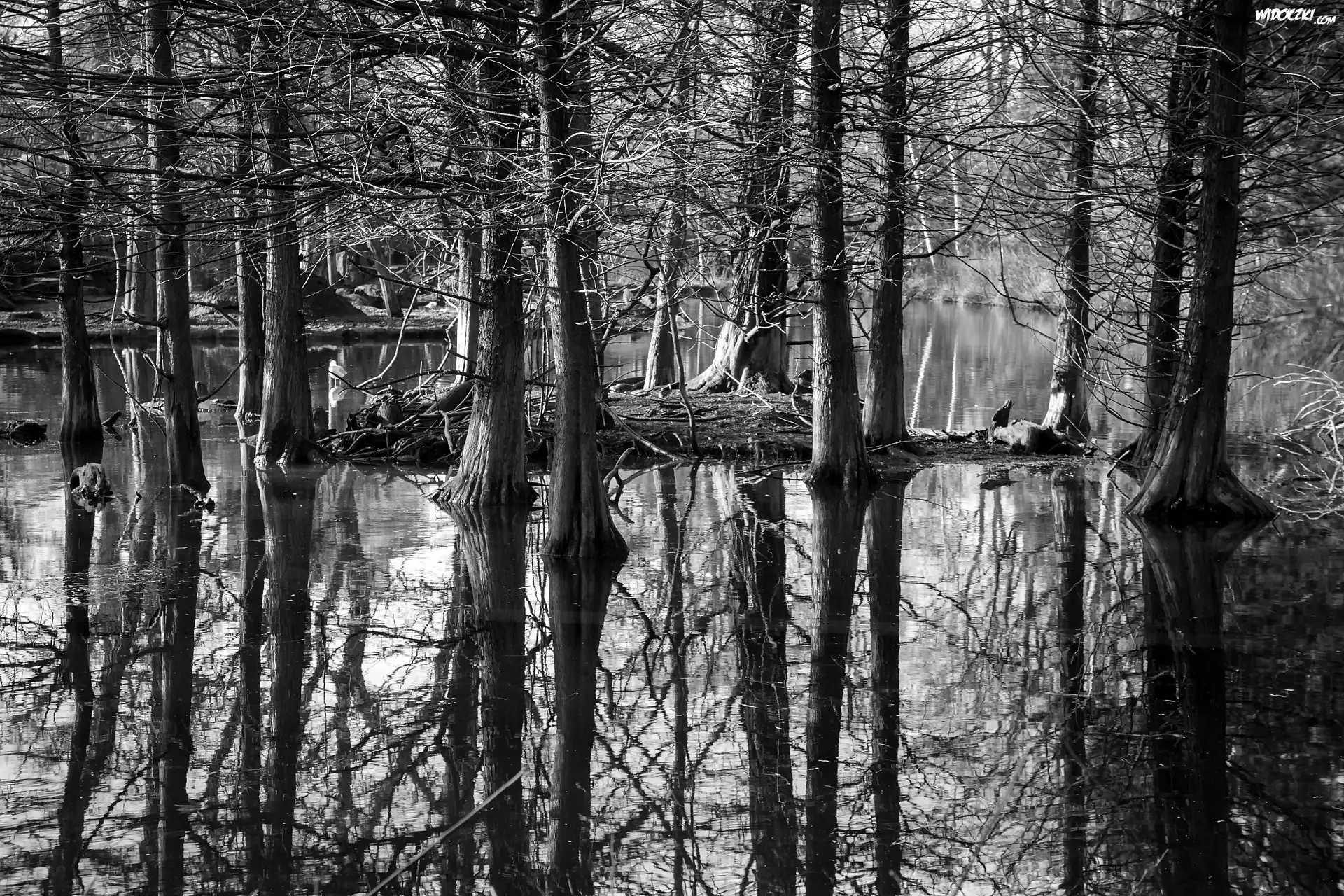 Zdjęcia, Las, Woda, Odbicie, Czarno-Białe