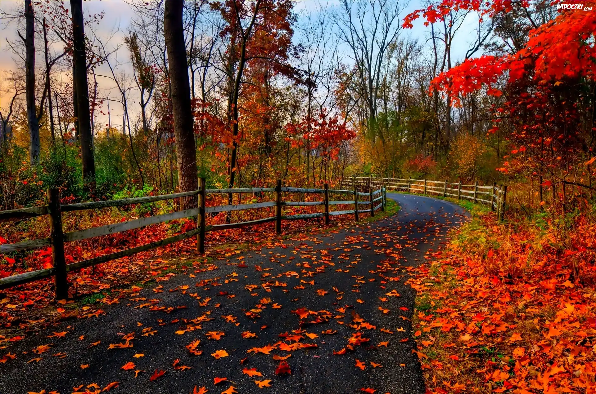 Las, Droga, Jesień, Czerwone, Liście