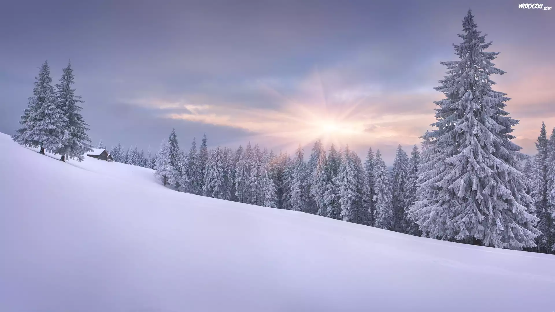 Zdjęcia, Zima, Las, Świerki, Wschód słońca, Chmury, Mgła, Dom