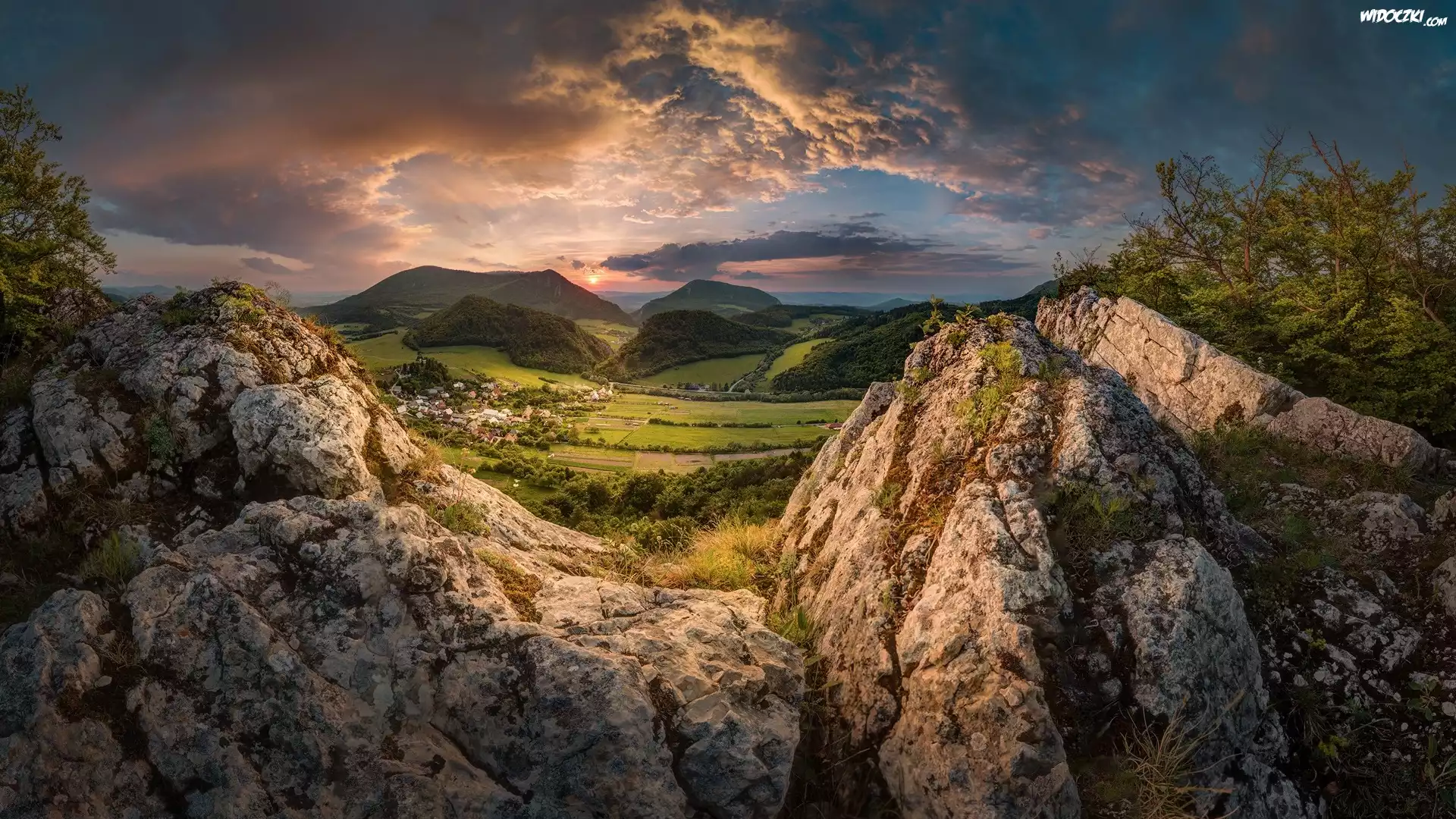 Góry, Dolina, Domy Las, Drzewa, Skały, Chmury