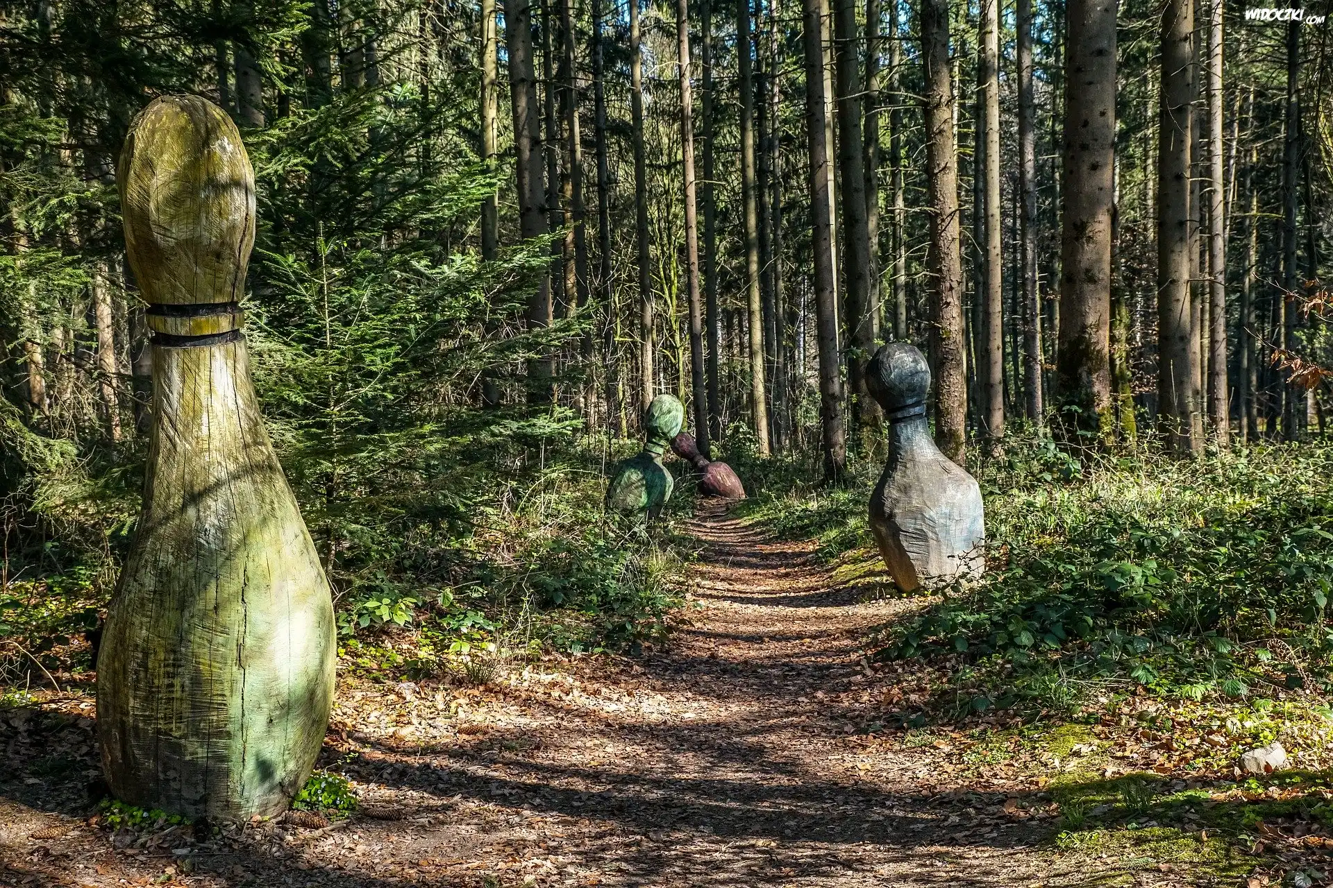 Zdjęcia, Las, Drzewa, Ścieżka, Drewniane, Kręgle