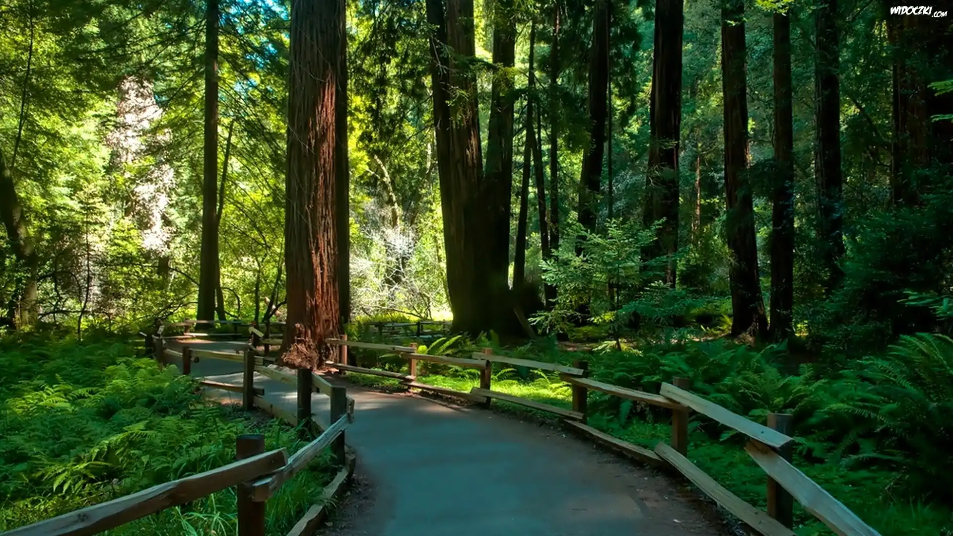 Zdjęcia, Las, Droga, Przebijające, Światło, Drewniane, Barierki