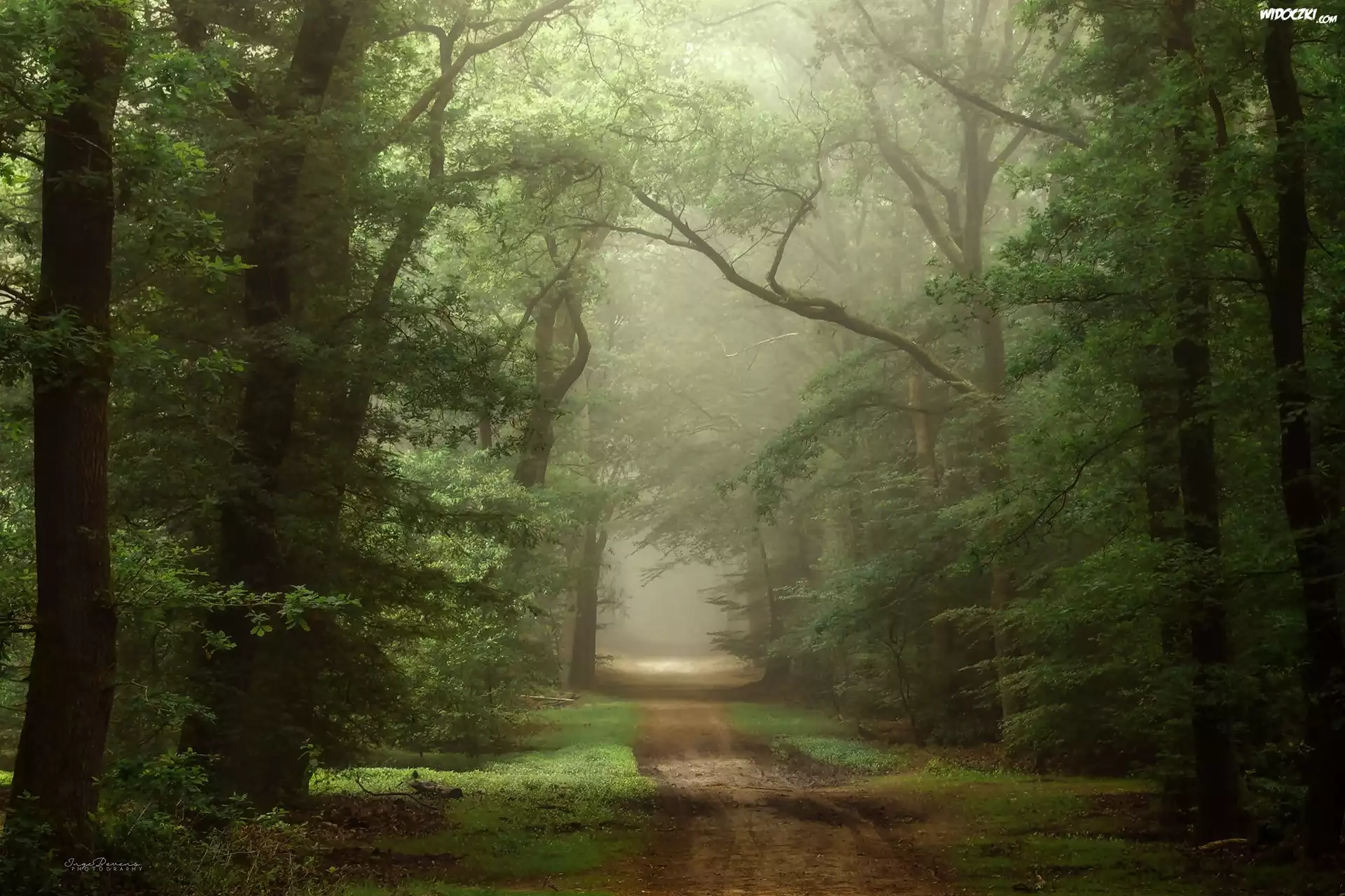 Zdjęcia, Las, Drzewa, Droga, Mgła