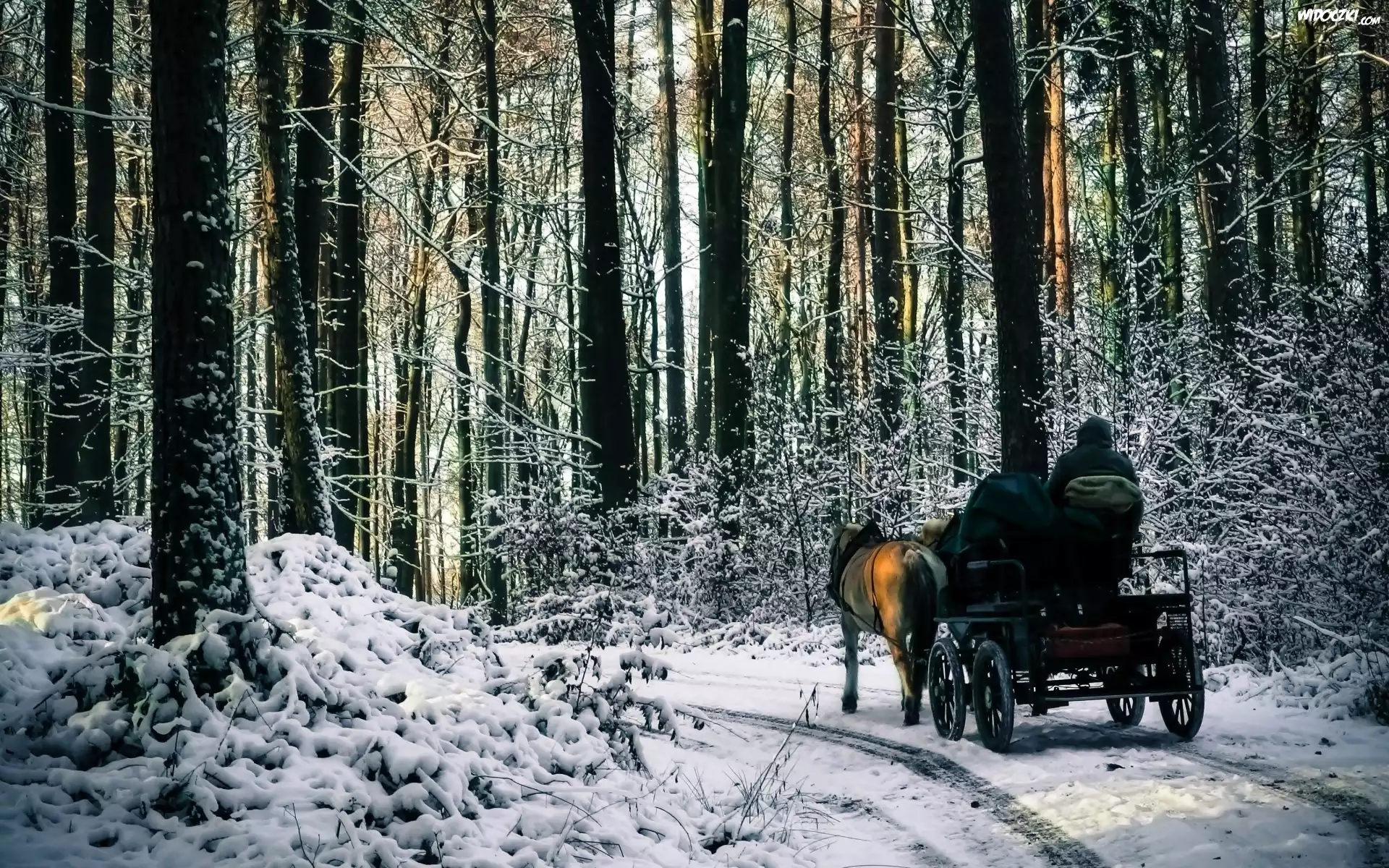 Zdjęcia, Las, Bryczka, Ludzie, Konie, Droga, Zima
