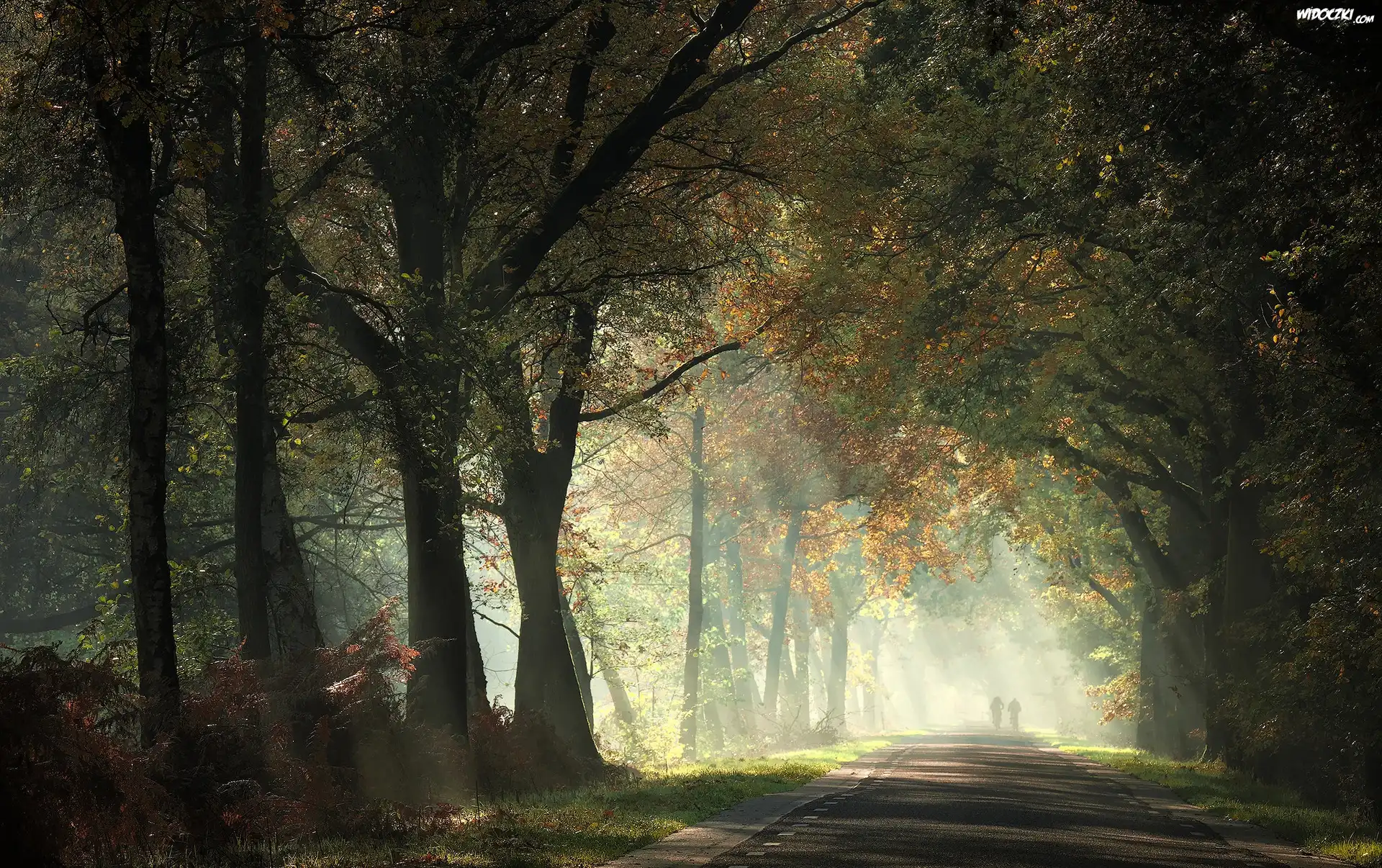 Las, Przebijające światło, Drzewa, Droga, Postacie