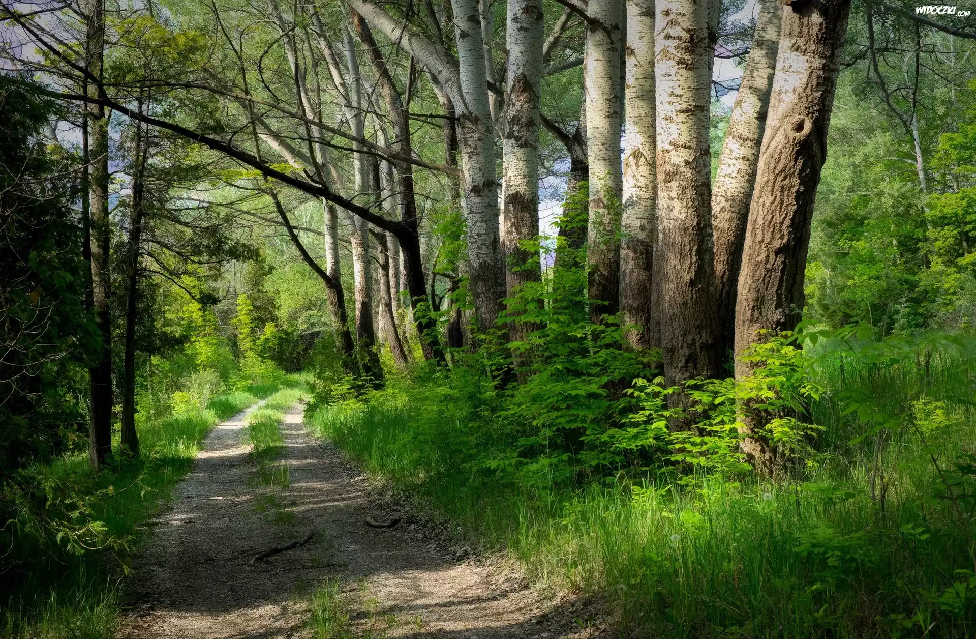 Zdjęcia, Las, Drzewa, Trawa, Droga, Roślinność
