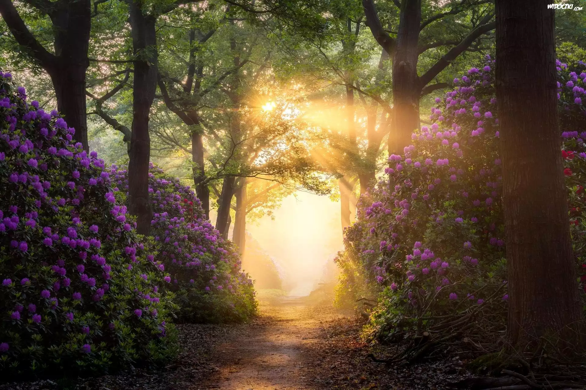 Las, Drzewa, Przebijające światło, Dróżka, Różaneczniki