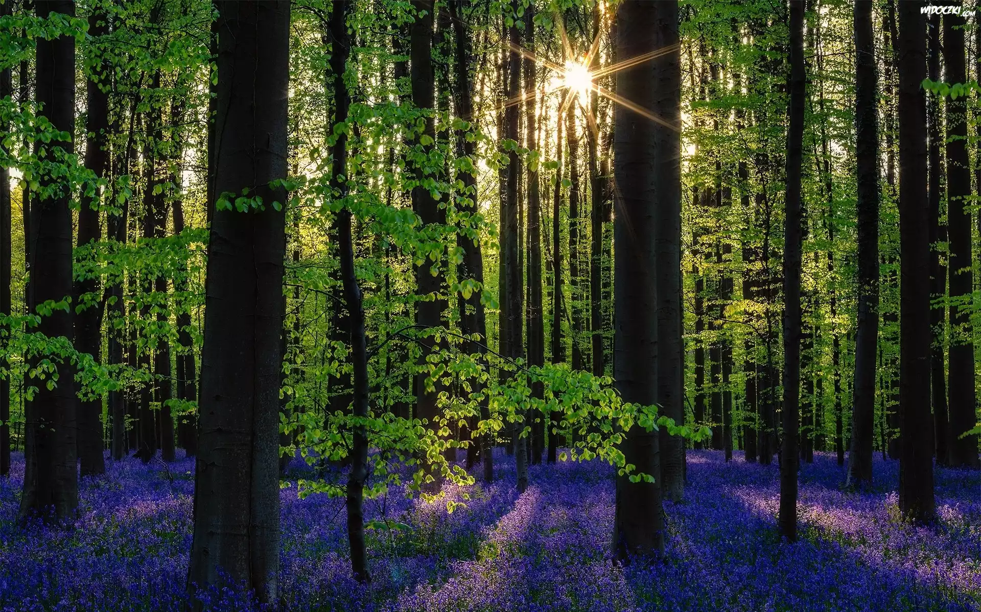 Zdjęcia, Belgia, Las Hallerbos, Kwiaty, Hiacyntowiec, Promienie słońca, Drzewa