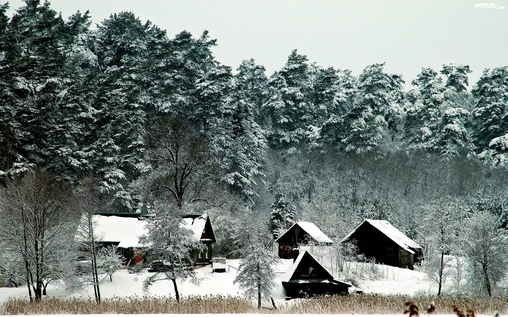 Zdjęcia, Las, Budynki, Drzewa, Zima
