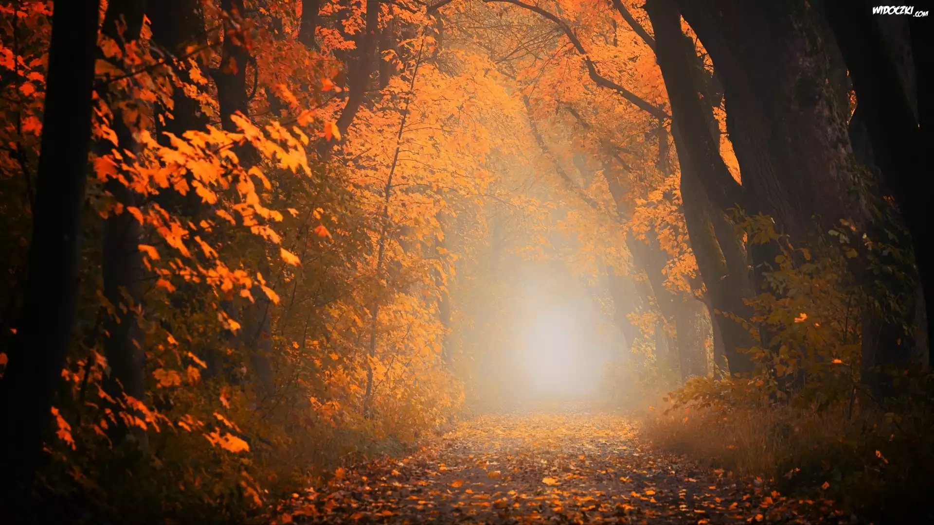 Zdjęcia, Las, Jesień, Ścieżka, Liście, Drzewa, Mgła