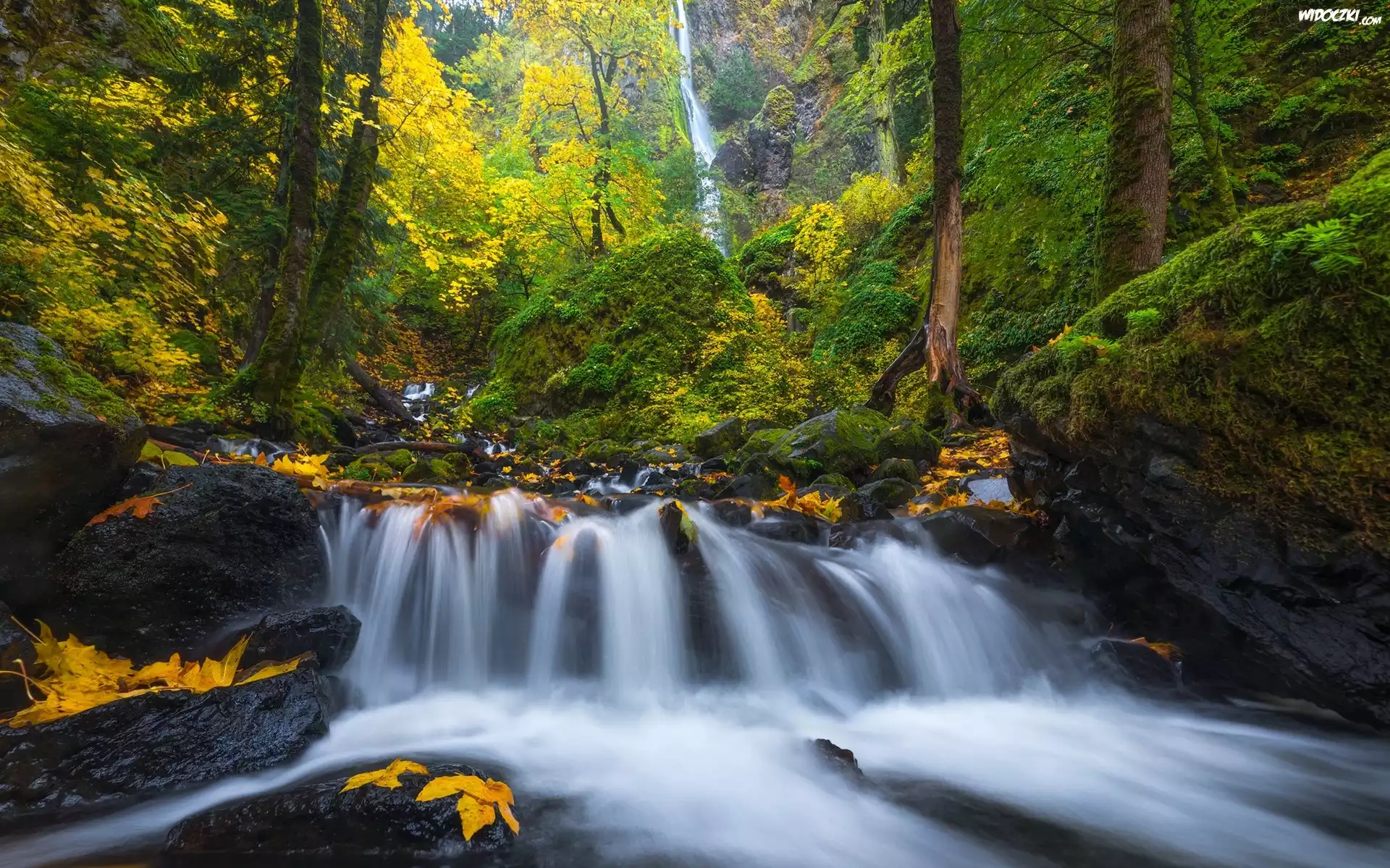 Las, Rzeka, Próg rzeczny, Skały, Kamienie, Drzewa, Liście, Jesień