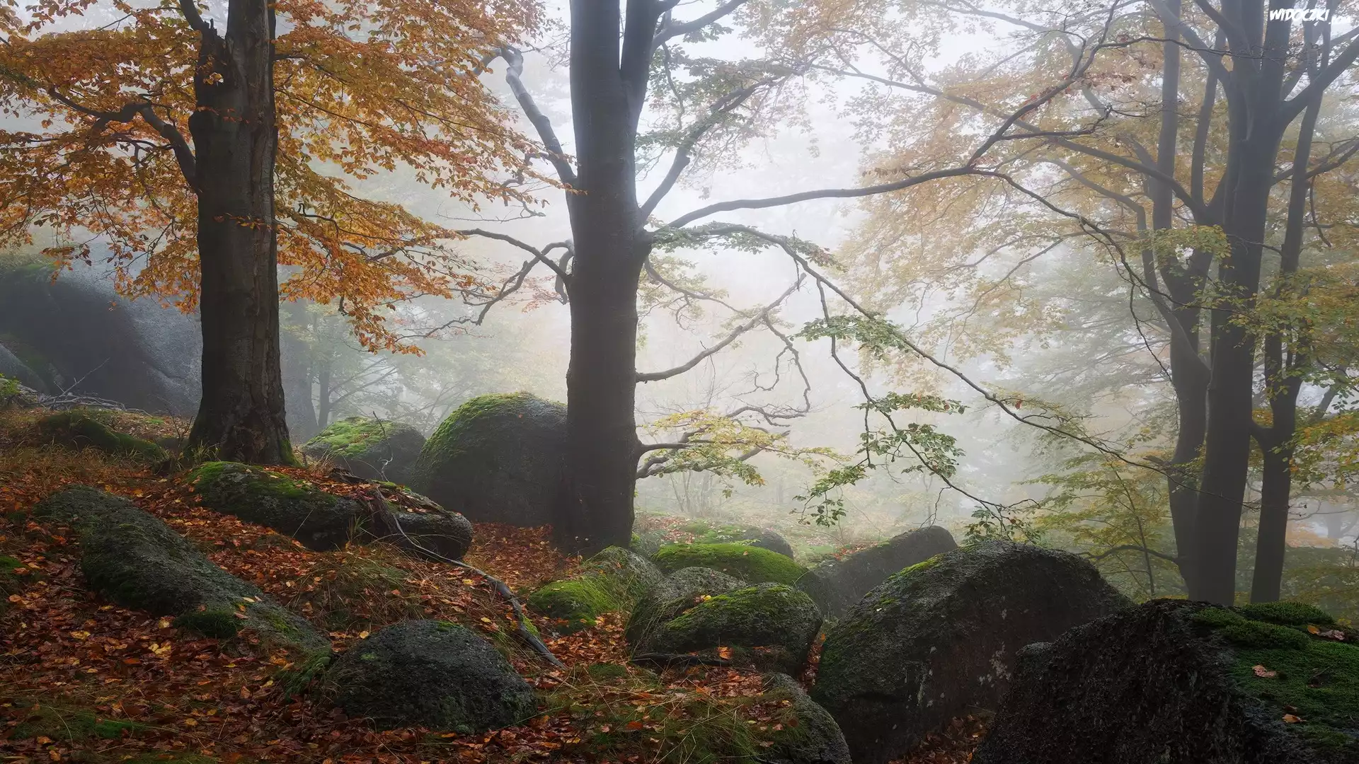 Zdjęcia, Jesień, Las, Drzewa, Głazy, Mgła