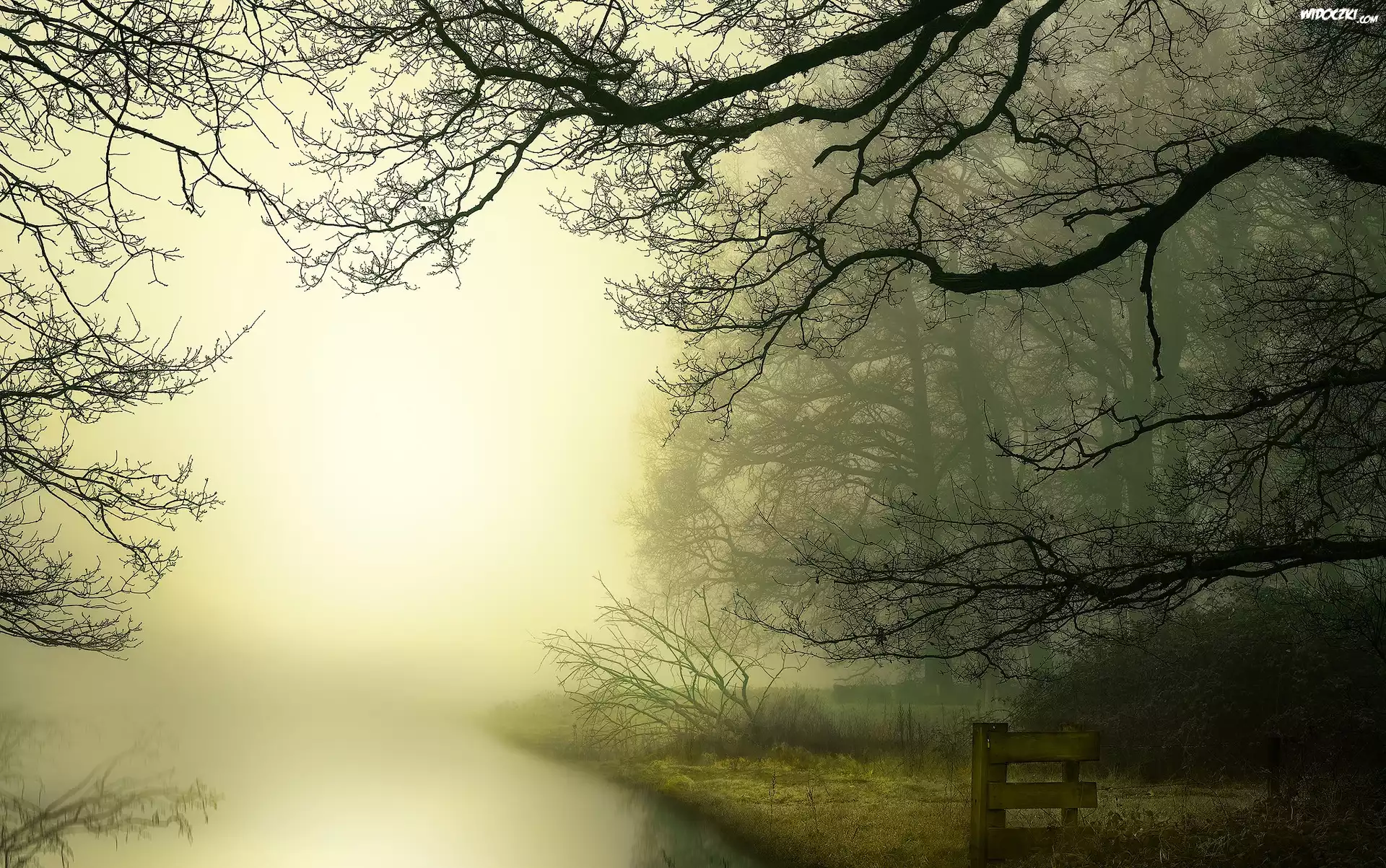 Las, Rzeka, Mgła, Drzewa, Gałęzie