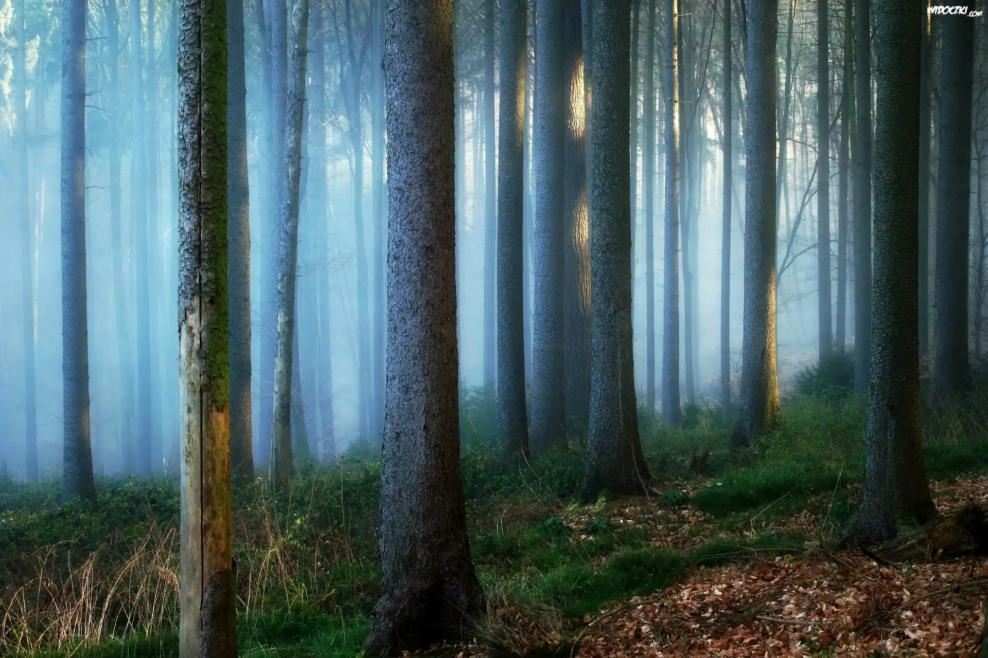 Zdjęcia, Las, Mgła, Drzewa, Trawa