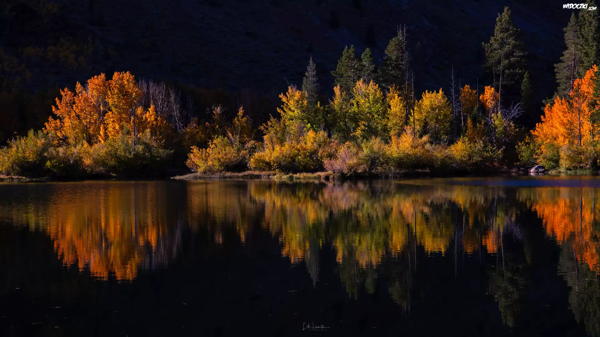 Jezioro, Las, Drzewa, Jesień, Odbicie