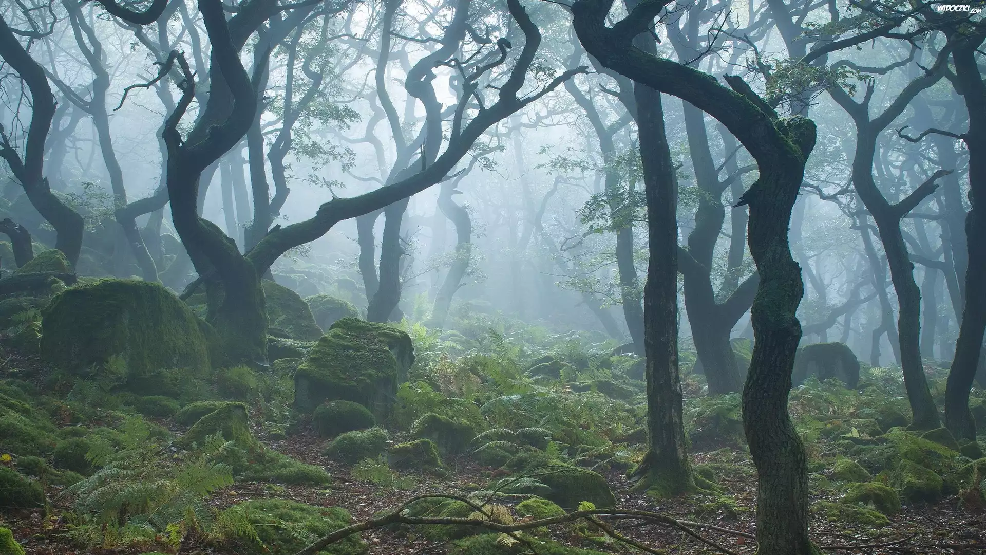 Las, Mgła, Omszałe Kamienie, Drzewa, Paprocie