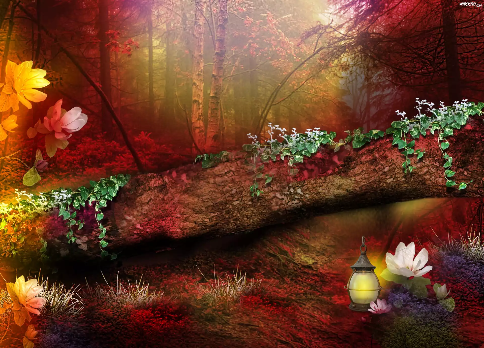 Las, Kwiaty, Pień, Drzewa, Lampa