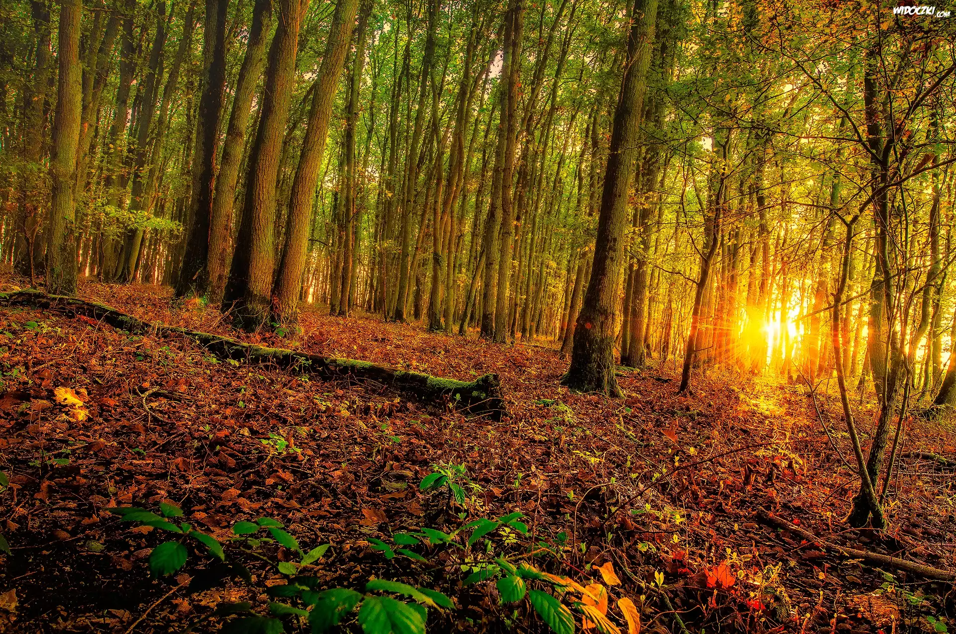 Zdjęcia, Las, Promienie słońca, Drzewa, Liście