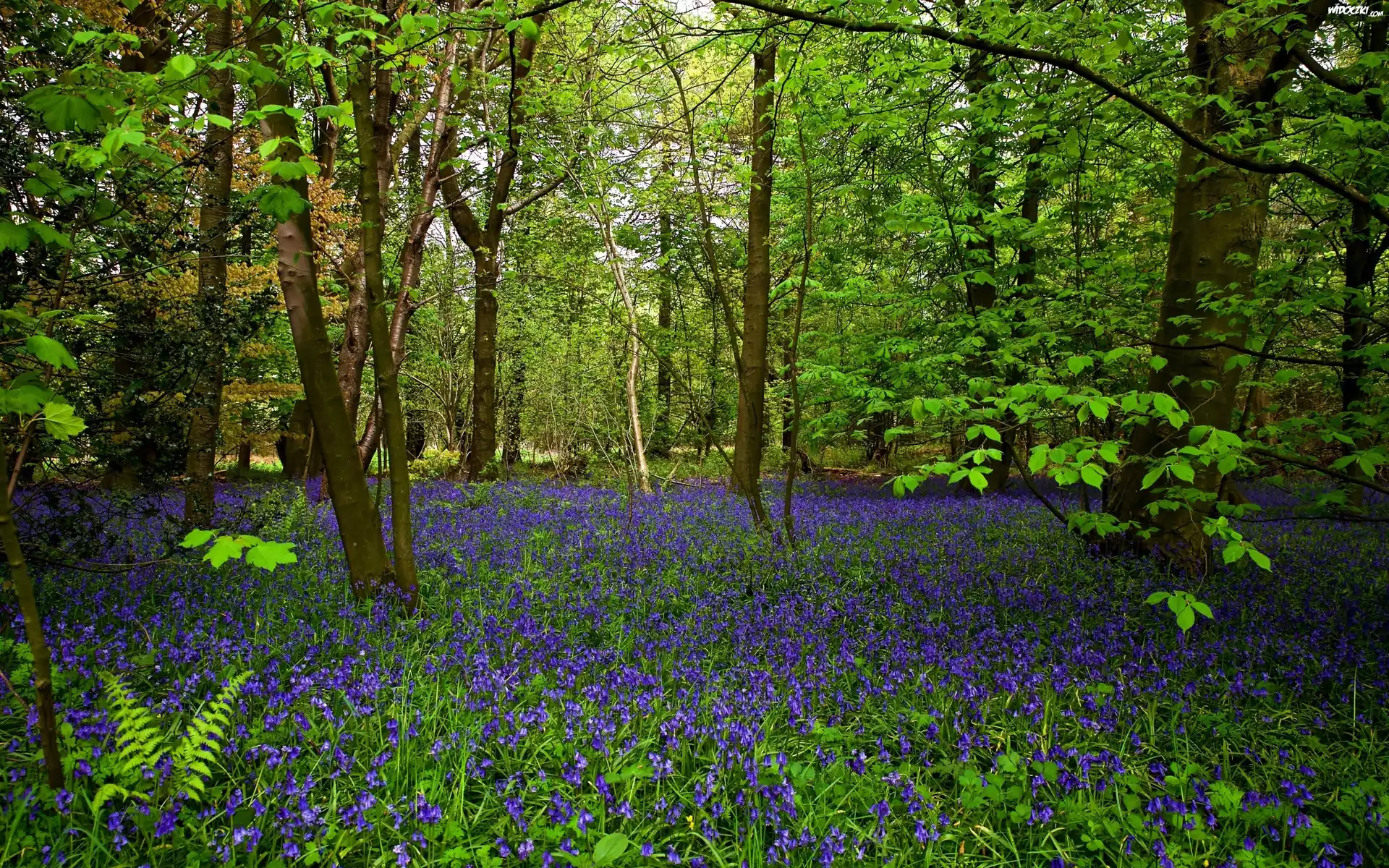 Las, Drzewa, Polana, Kwiaty, Dzwonki, Wiosna
