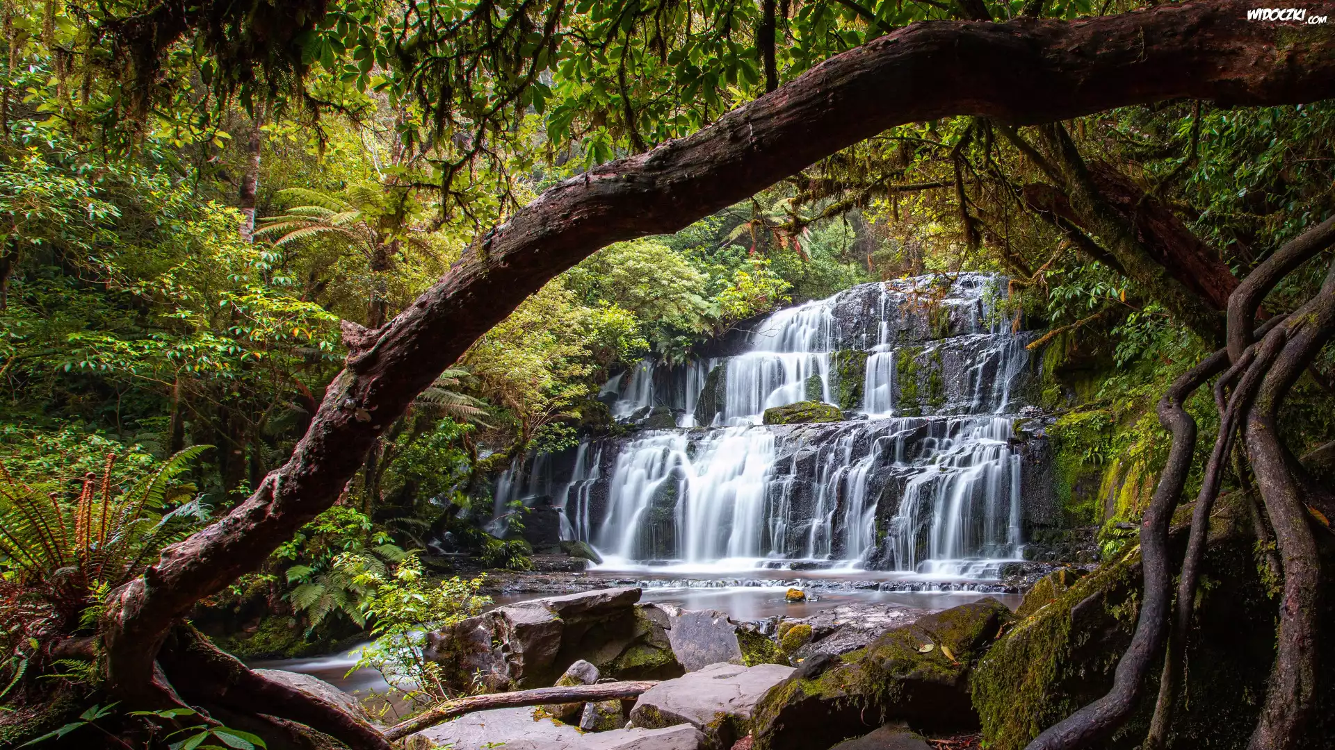 Zdjęcia, Las, Drzewa, Wodospad, Kamienie, Mech, Purakaunui Falls, Nowa Zelandia