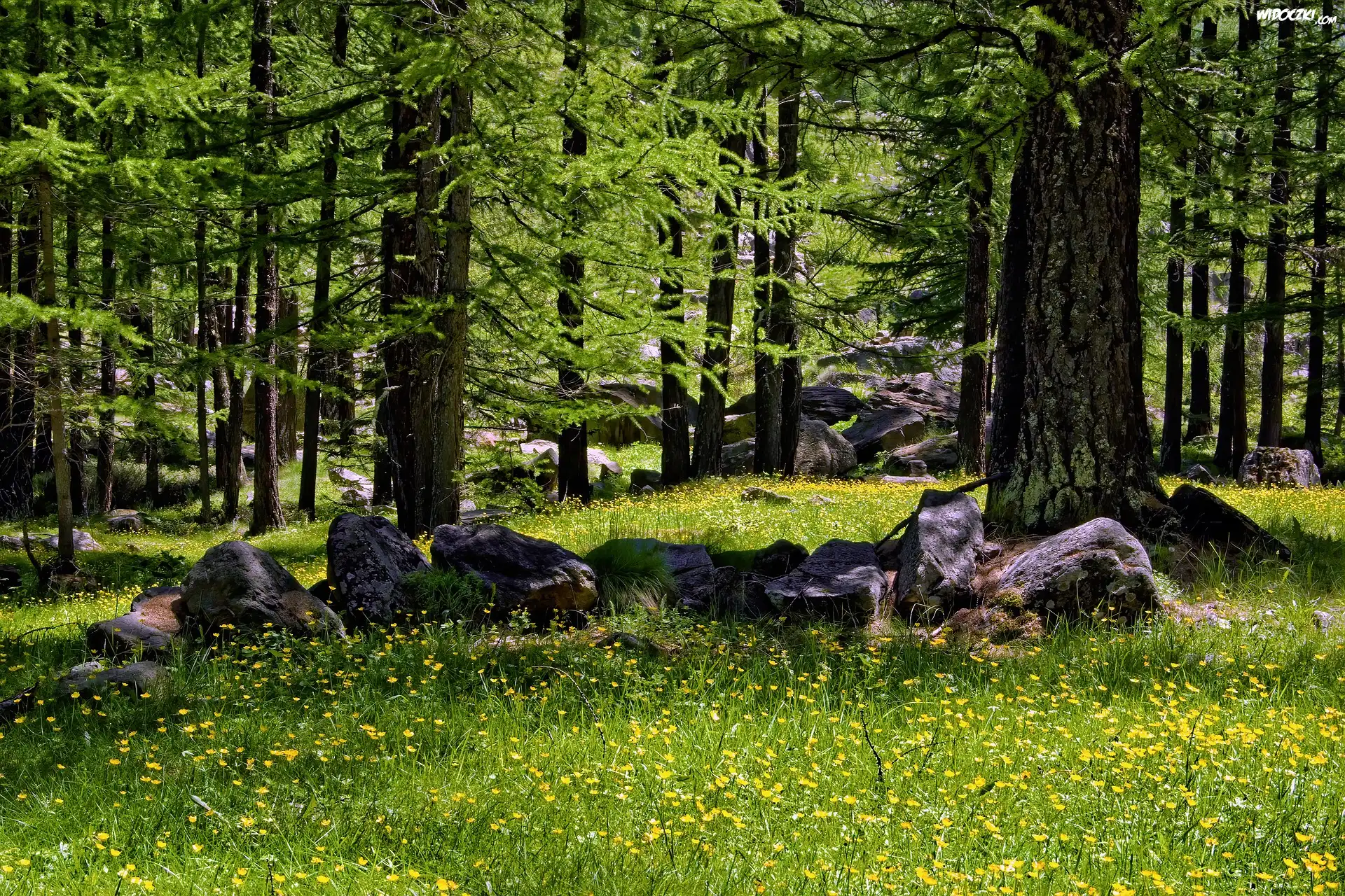 Zdjęcia, Drzewa, Las, Głazy, Kamienie, Kwiaty