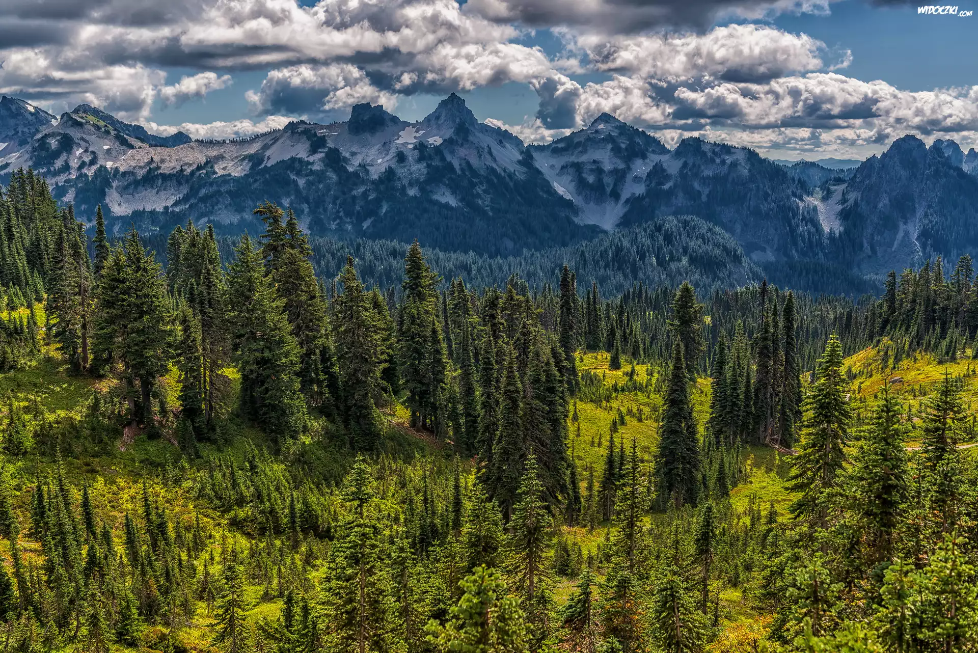 Zdjęcia, Drzewa, Las, Góry, Niebo, Chmury
