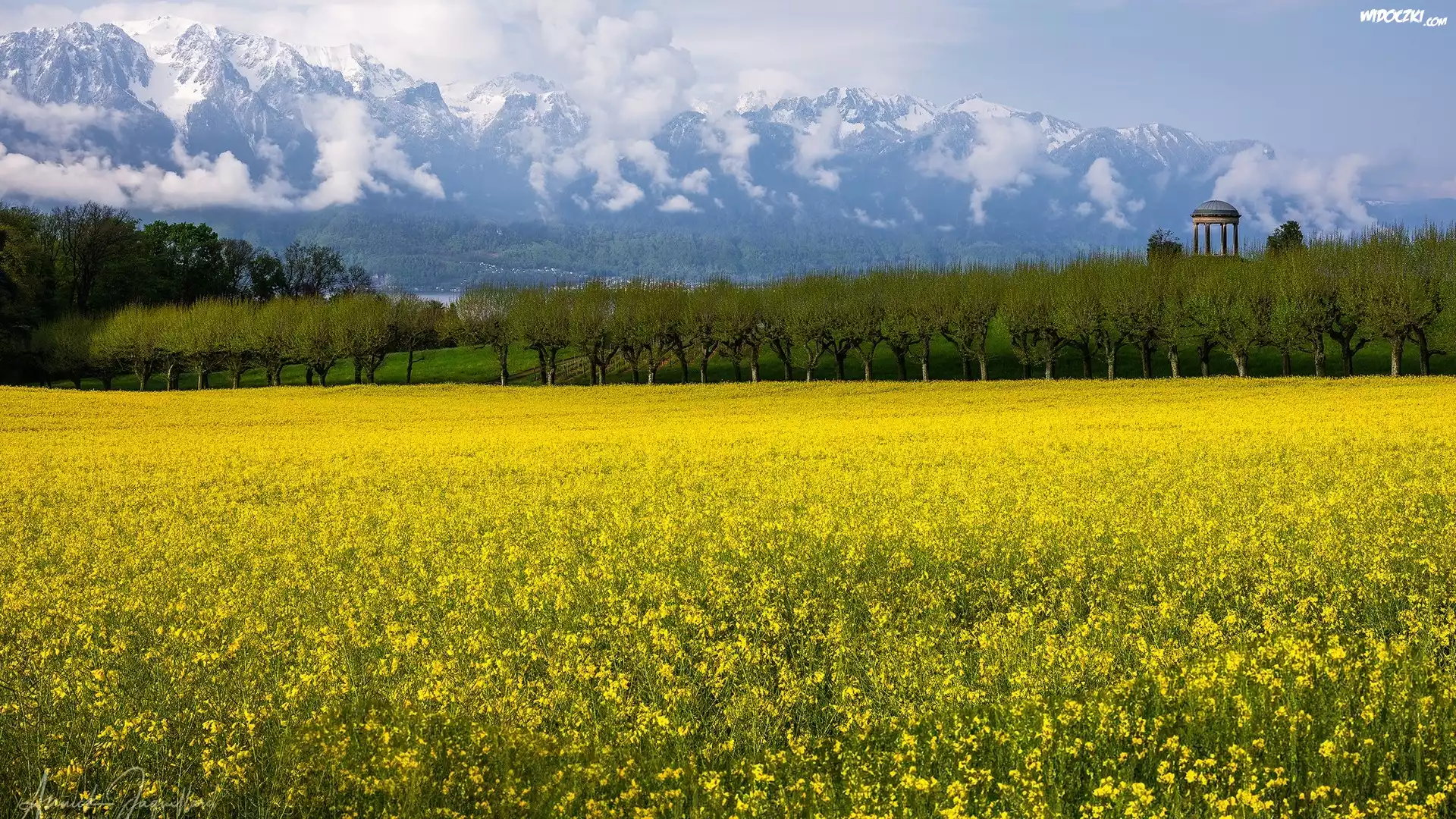 Pole, Rzepak, Góry, Las, Drzewa, Mgła, Chmury