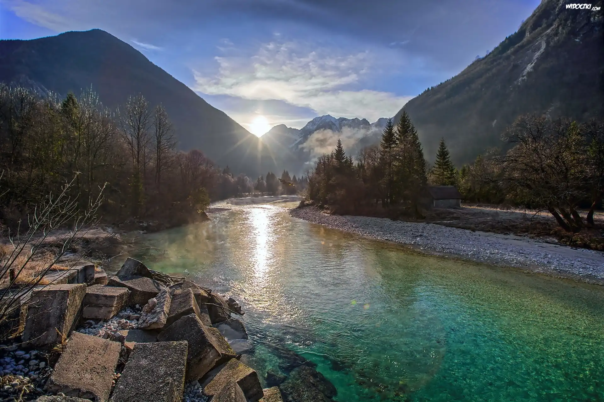 Zdjęcia, Góry, Las, Rzeka, Kamienie, Promienie Słońca, Słowenia