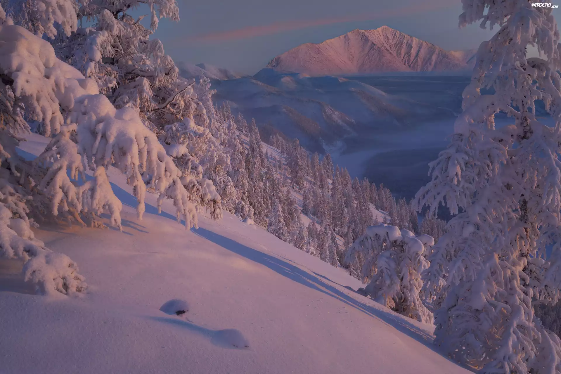 Zima, Śnieg, Góry, Las, Ośnieżone, Drzewa, Poranek