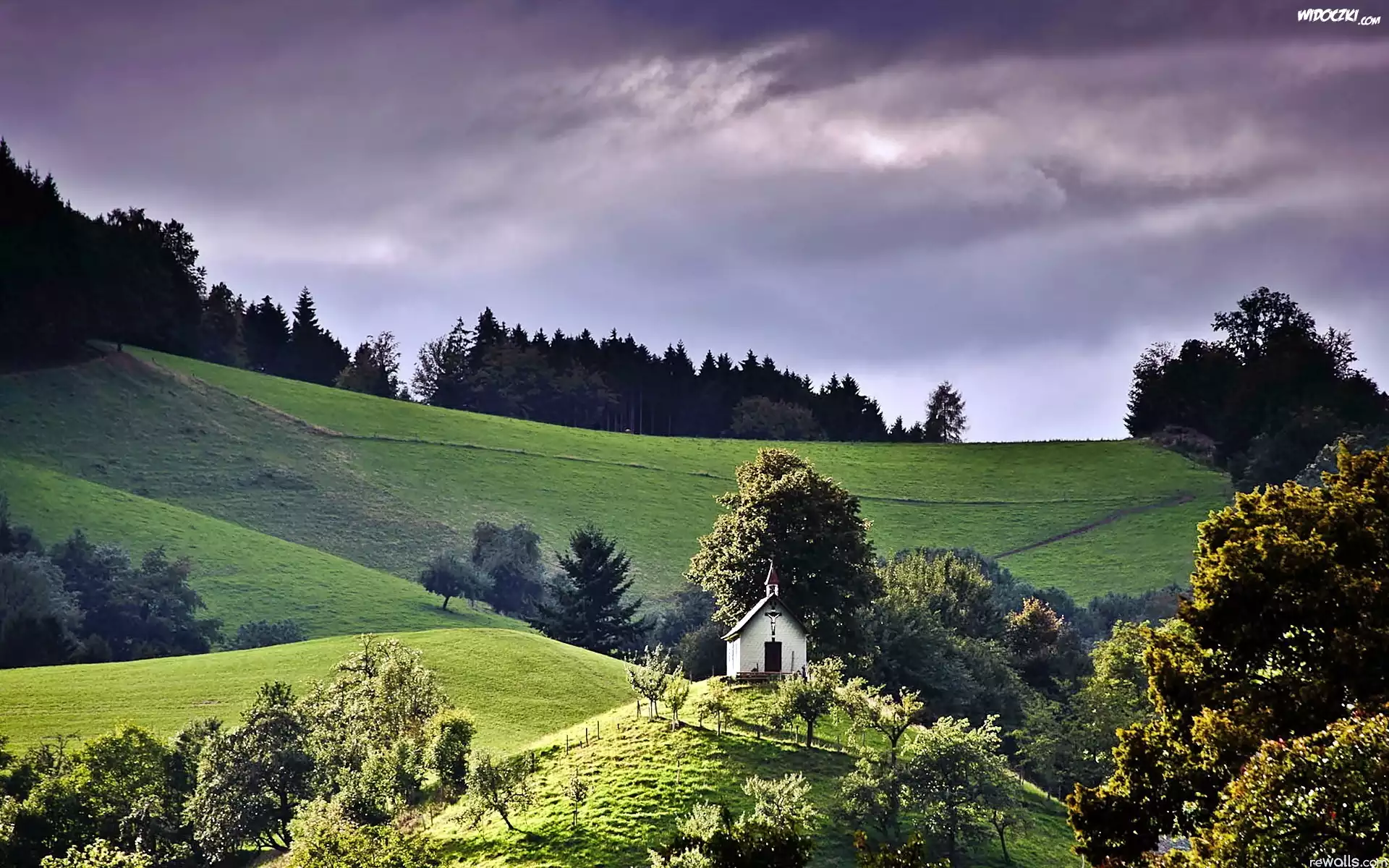 Góry, Las, Pola, Kościółek, Drzewa, Przebijające, Światło