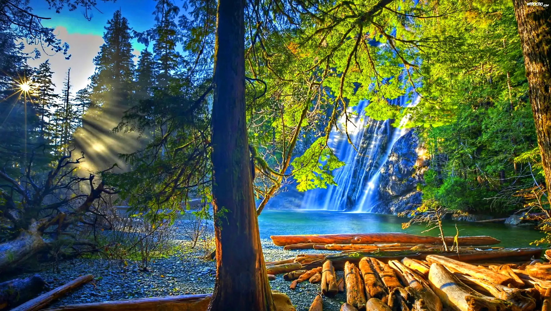 Zdjęcia, Wodospad, Las, Rzeka, Kłody, Wschód Słońca, USA, HDR