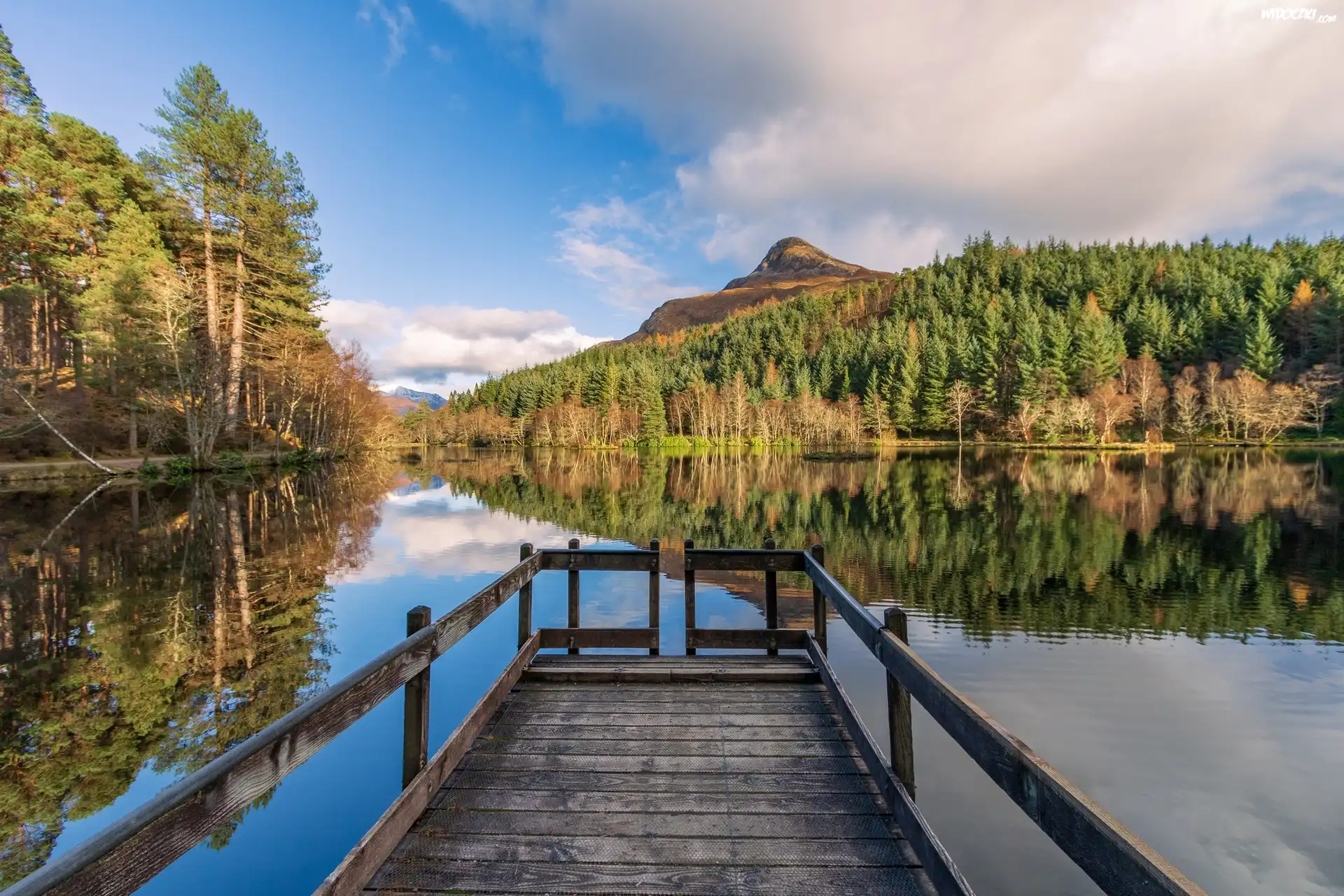 Zdjęcia, Jezioro, Pomost, Góry, Las, Drzewa, Jesień