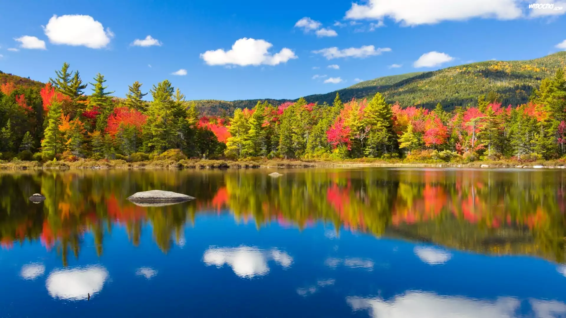 Zdjęcia, Jezioro, Las, Kolorowe, Drzewa, Góry Białe, USA, Jesień