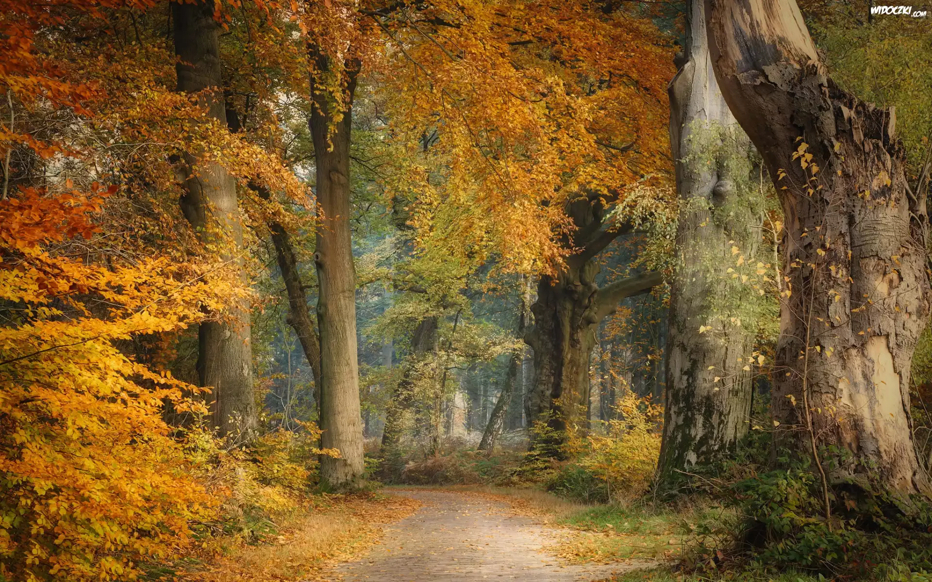 Zdjęcia, Las, Drzewa, Kolorowe, Liście, Jesień, Droga