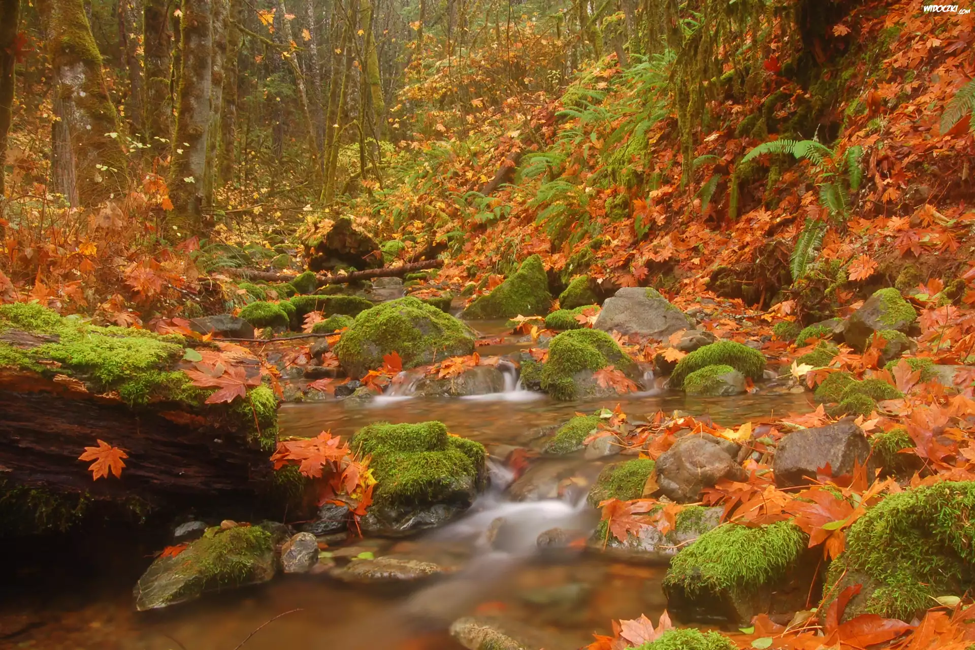 Zdjęcia, Jesień. Las, Rzeka, Omszałe, Kamienie, Żółte, Liście