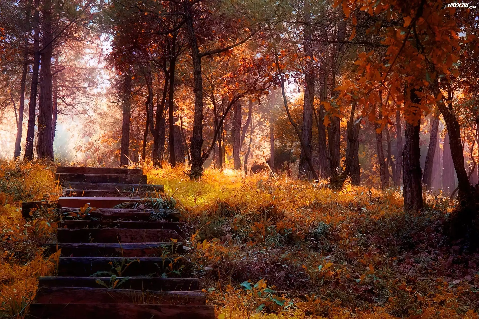 Zdjęcia, Las, Liście, Jesień, Schodki