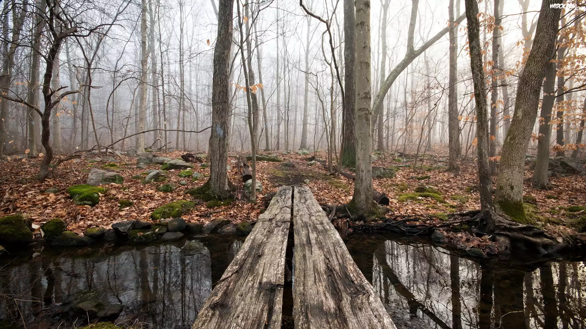 Las, Drzewa, Rzeczka, Kładka, Jesień, Mgła