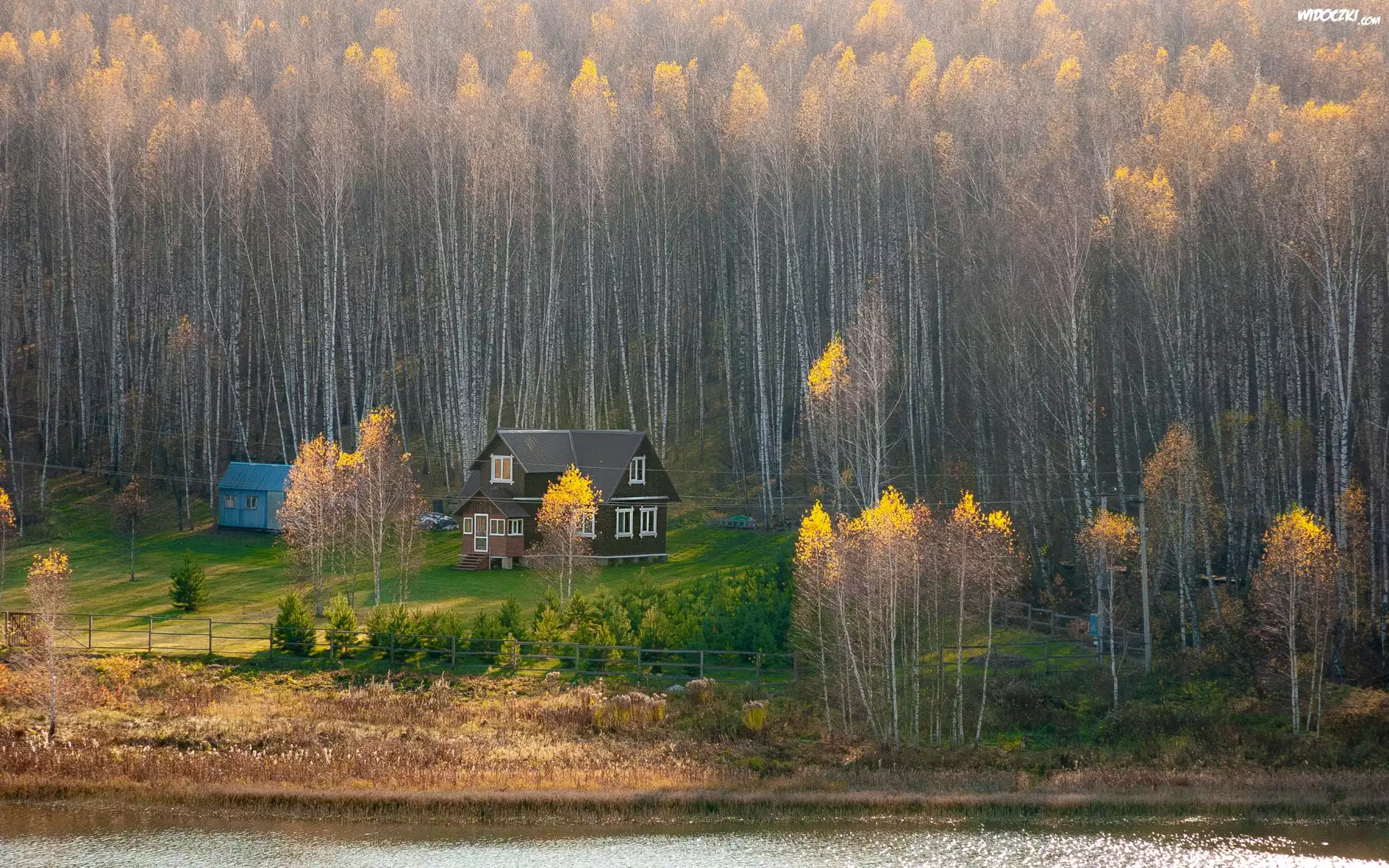 Jesień, Las, Drzewa, Topole osikowe, Dom, Rzeka