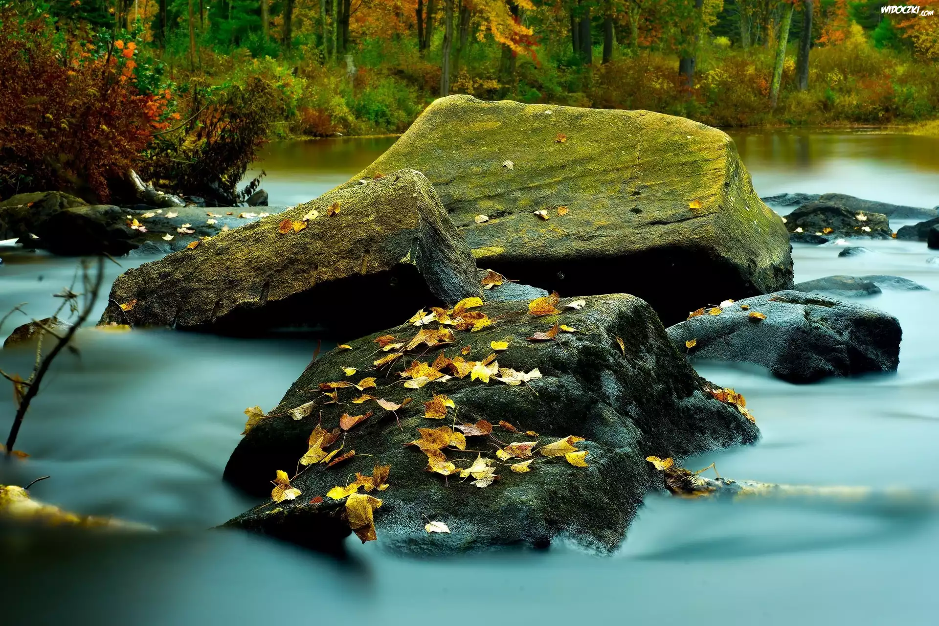 Zdjęcia, Las, Rzeka, Skały, Jesień, Kamienie