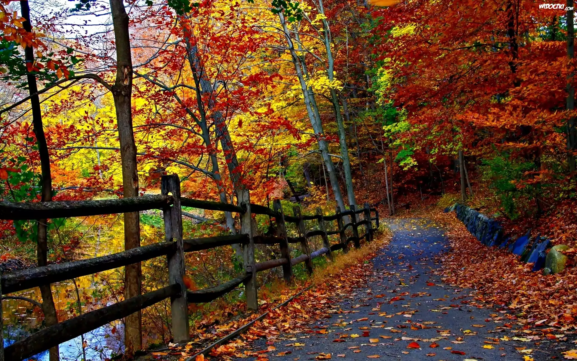 Zdjęcia, Jesień, Las, Drzewa, Droga, Liście, Ogrodzenie, Staw