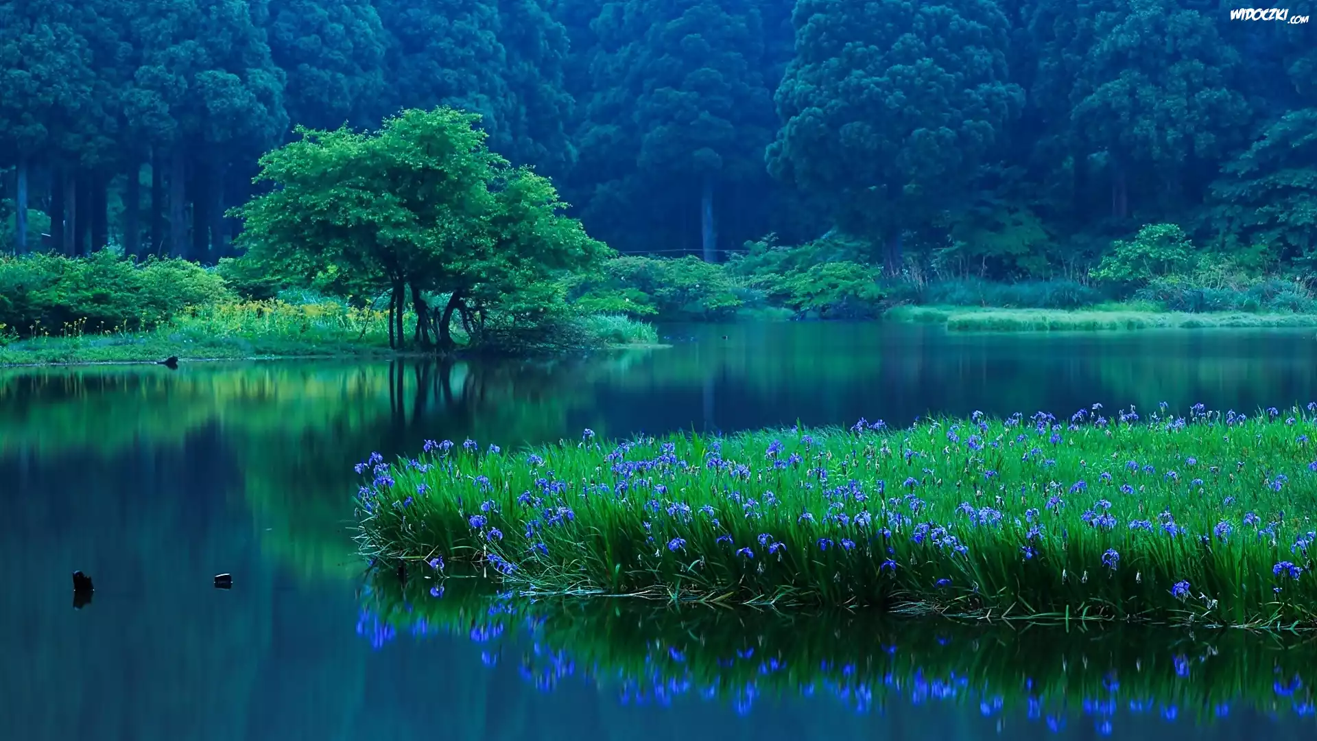 Zdjęcia, Jezioro, Las, Irysy
